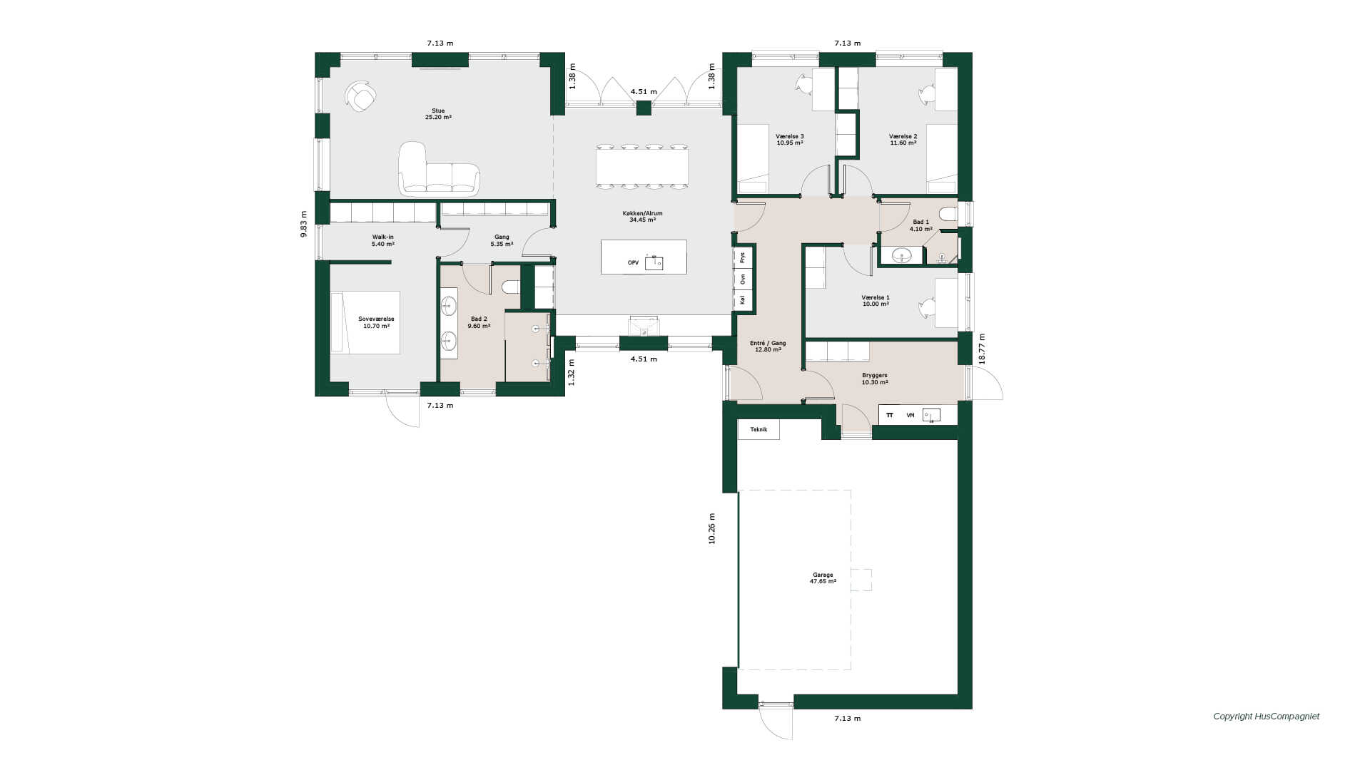 Et H-hus med fokus op store leverum. Her er husets absolutte hjerte, det store køkken/alrum, der ligger i åben forbindelse med stuen. Her er plads til gæster. Forældreafdelingen rummer dejligt soveværelse, badeværelse med dobbelt brus, walk-in og gang med masser af skabsplads.