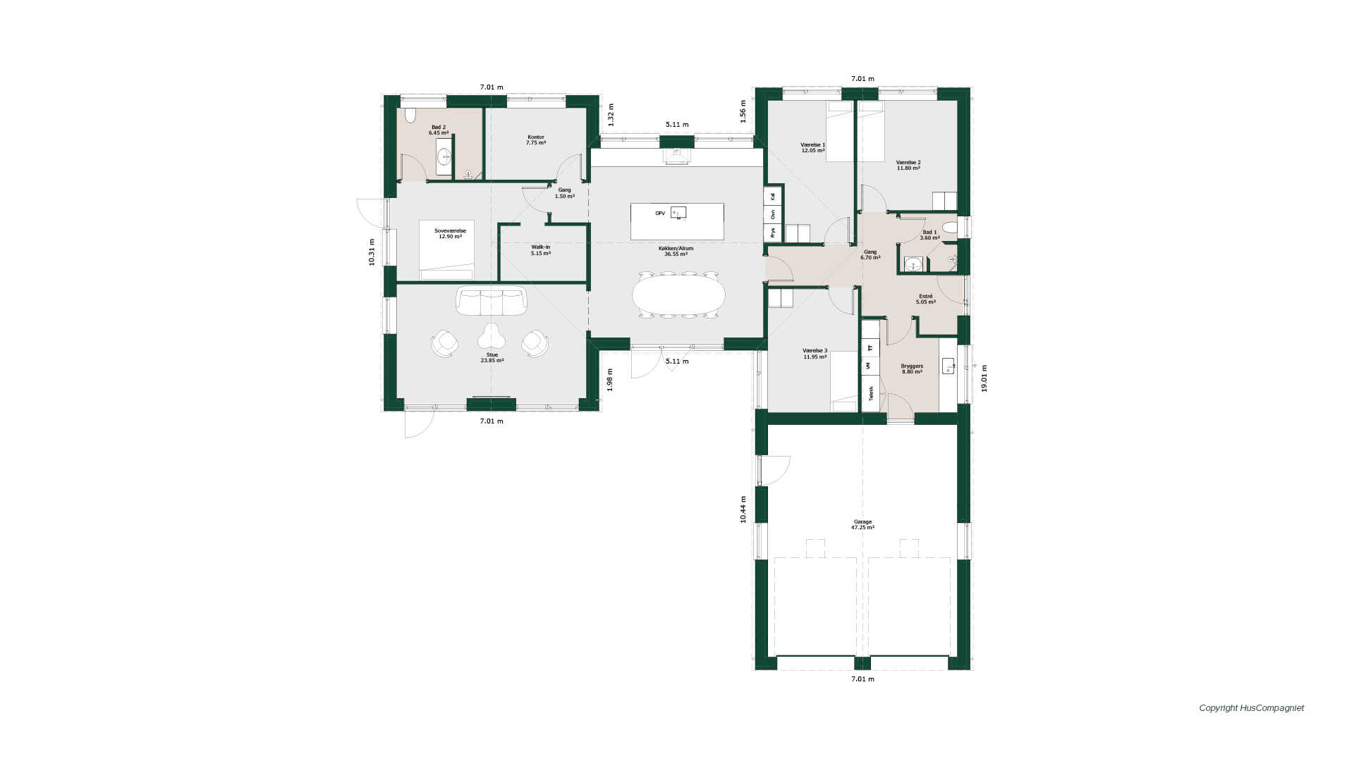 Husets form bidrager til naturlig opdeling af husets mange funktioner og skaber naturlige lækroge i terrasseområderne. Med 3 store børneværelser og et mindre kontor i separat børneafdeling, er her plads til den store børnefamilie. Centralt i huset ligger det store køkken/alrum med lysindfald fra to sider og udgang til terrasse samt stue. Forældreafdelingen byder på stort soveværelse, badeværelse og walk-in. Den dobbelte garage med to porte giver ligeledes tørskoet adgang til husets bryggers.