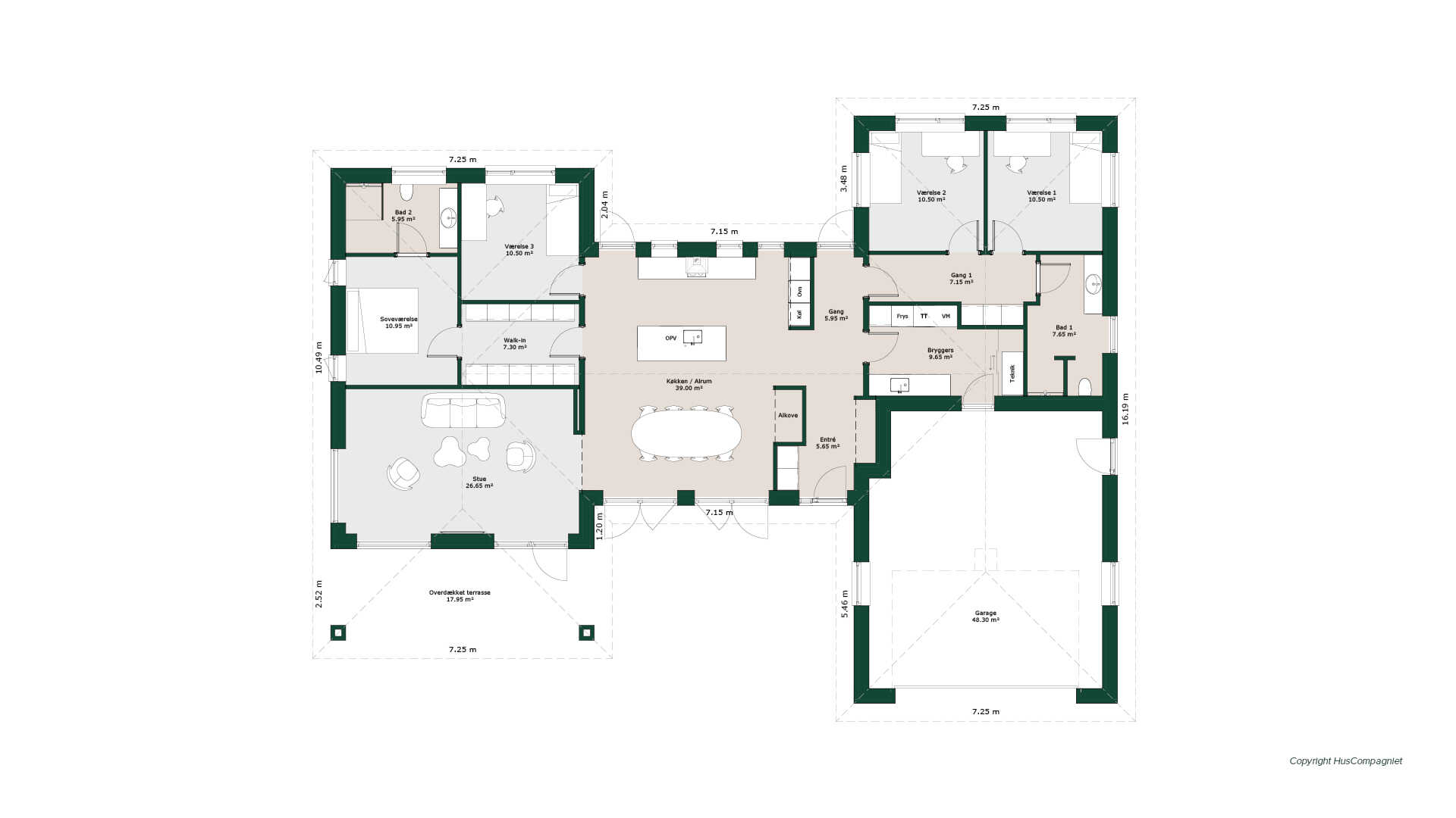 Optimal planløsning for børnefamilien. Her kommer man tørskoet ind i husets bryggers via garagen. Her byder husets hjerte - det store køkken/alrum på hyggelig alkove og en biopejs mellem alrum og stue. Her er 3 gode børneværelser og masser af opbevaring i både bryggers og de indbyggede skabsvægge. Forældreafdelingen har både walk-in og eget bad. Husets H-form og terrassedørene i køkken/alrummet skaber mulighed for at skabe gode uderum med gode lækroge og med den overdækkede terrasse er sommeraftenerne forlænget.