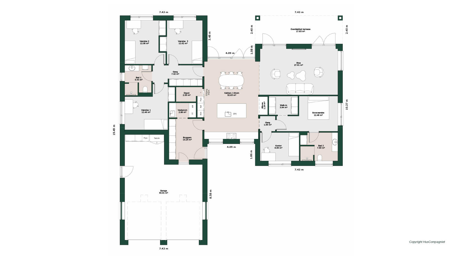 Lækkert H-hus med god børneafdeling med 3 gode værelser, eget bad samt stor skabsvæg. Fra den store garage kommer man til husets kombinerede bryggers/entré som har praktisk vaskerum tilknyttet. Det gennemgående køkken/alrum er husets hjerte med store vinduespartier som giver masser af lys. Ligeledes rummer køkkenet et godt depot samt hyggelig alkove. Fra køkkenet er der adgang til voksenafdeling med kontor, soveværelse, walk-in og badeværelse. Fra den hyggelige stue er der udgang til god overdækket terrasse.