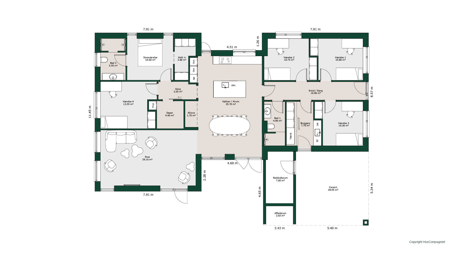 Her er planløsningen med fokus på masser af god opbevaring. I forbindelse med carporten ligger der redskabsrum og et smart affaldsrum, hvor man kan skjule renovationsspandene bedst muligt.