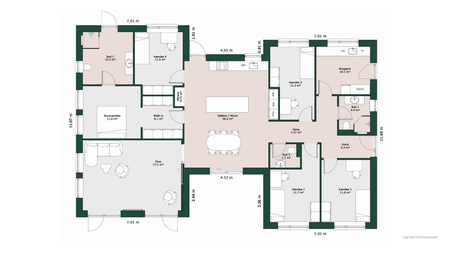 En helt igennem rummelig og lækker planløsning. Børneafdelingen indeholder tre store børneværelser, badeværelse og gæstetoilet.