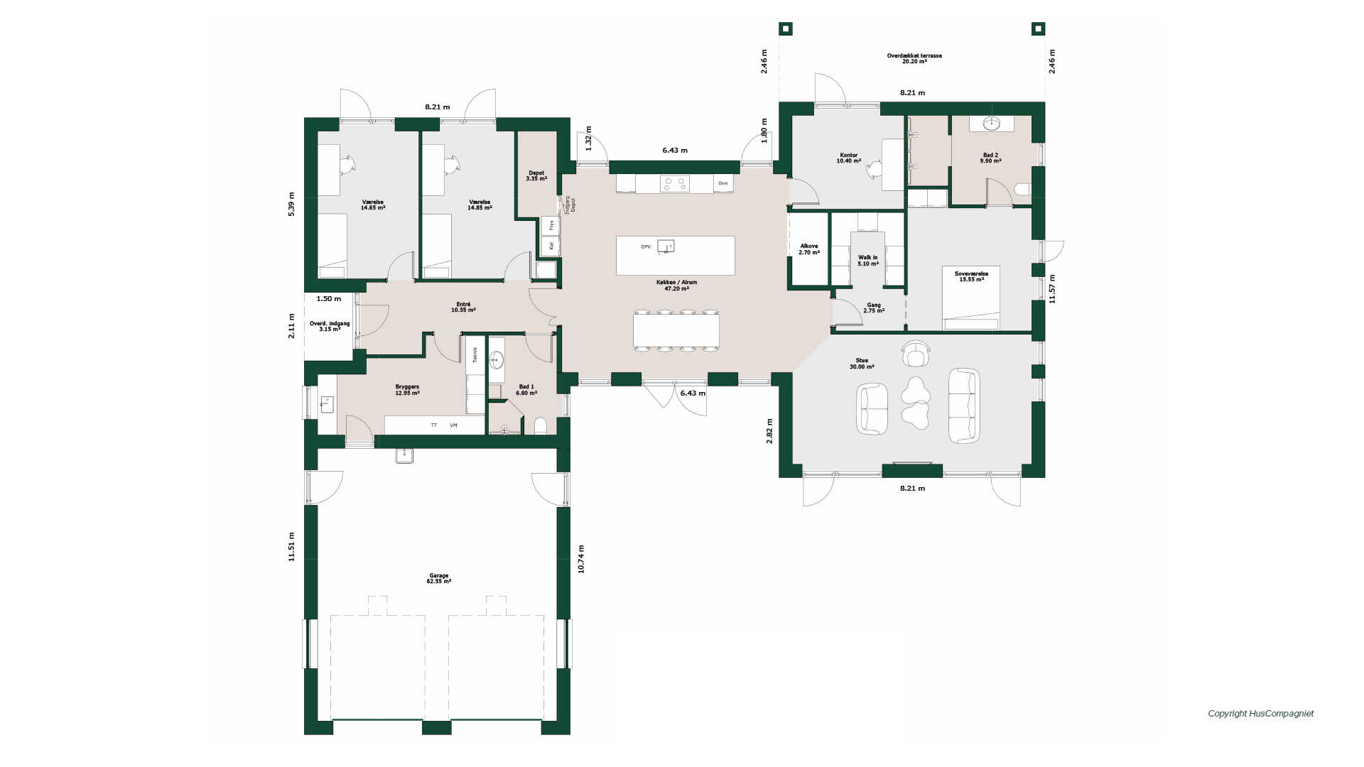 Husets hjerte er det store køkken/alrum, hvorfra der er adgang til et godt depot, stuen og husets separate værelsesafdeling, hvor entréen og det store bryggers også ligger. Bemærk, hvordan det tværgående køkken/alrum giver lysindfald fra to sider, ligesom H-huset skaber nogle helt unikke uderum med gårdmiljø, hygge- og lækroge med kig til have igennem husets store vinduespartier, der giver et fantastisk lysindfald.