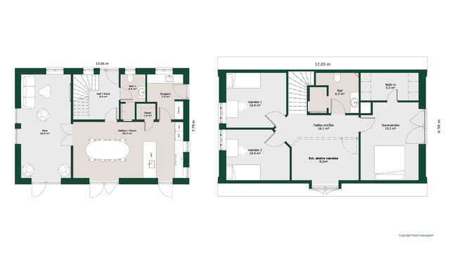 I stueetagen er der stort køkken/alrum og stor stue en suite. Begge er indrettet med store vinduespartier og døre mod haven. På førstesalen er også prioriteret en stor repos mellem soveværelse og to børneværelser - den er der rig mulighed for at udnytte til multirum, kontor eller blot en ekstra lille stue.