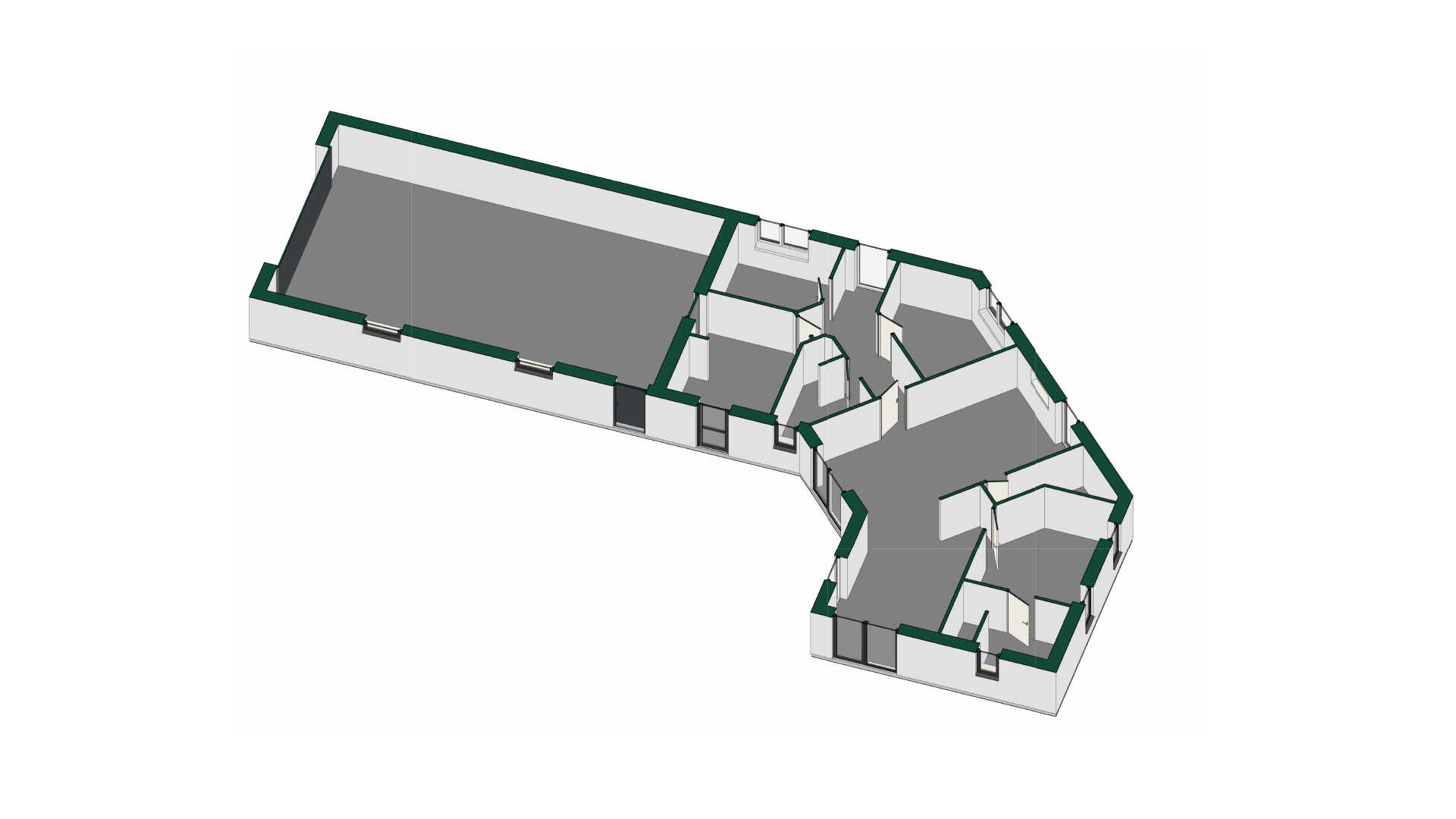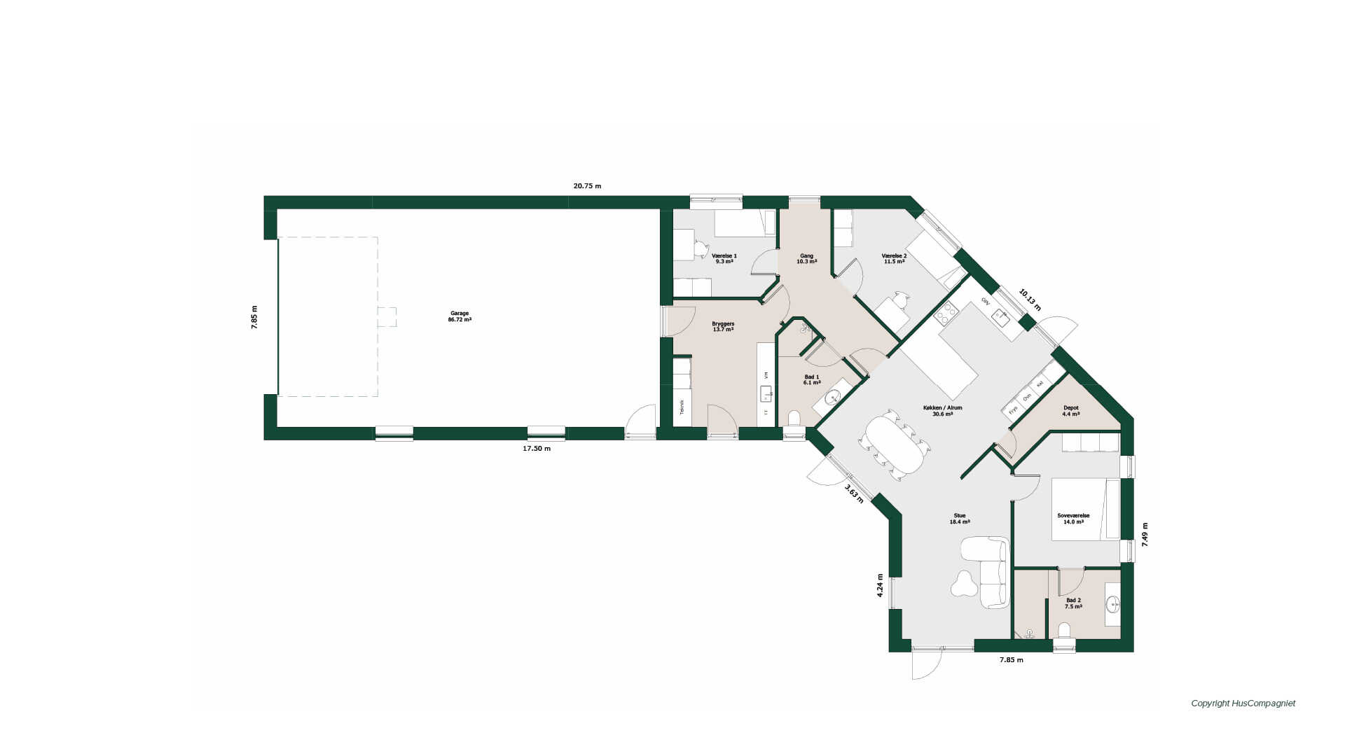 En helt igennem optimeret planløsning til den mindre familie. De to børneværelser ligger i forbindelse med badeværelse og det store bryggers. Husets leverum - Køkken/alrummet ligger i husets midte og har udgang til begge sider af huset. Stuen ligger i åbne forbindelse med alrummet, men husets knæk-form bidrager til en ligge vinkel. I forbindelse med køkkenet ligger der stort og praktisk depot.