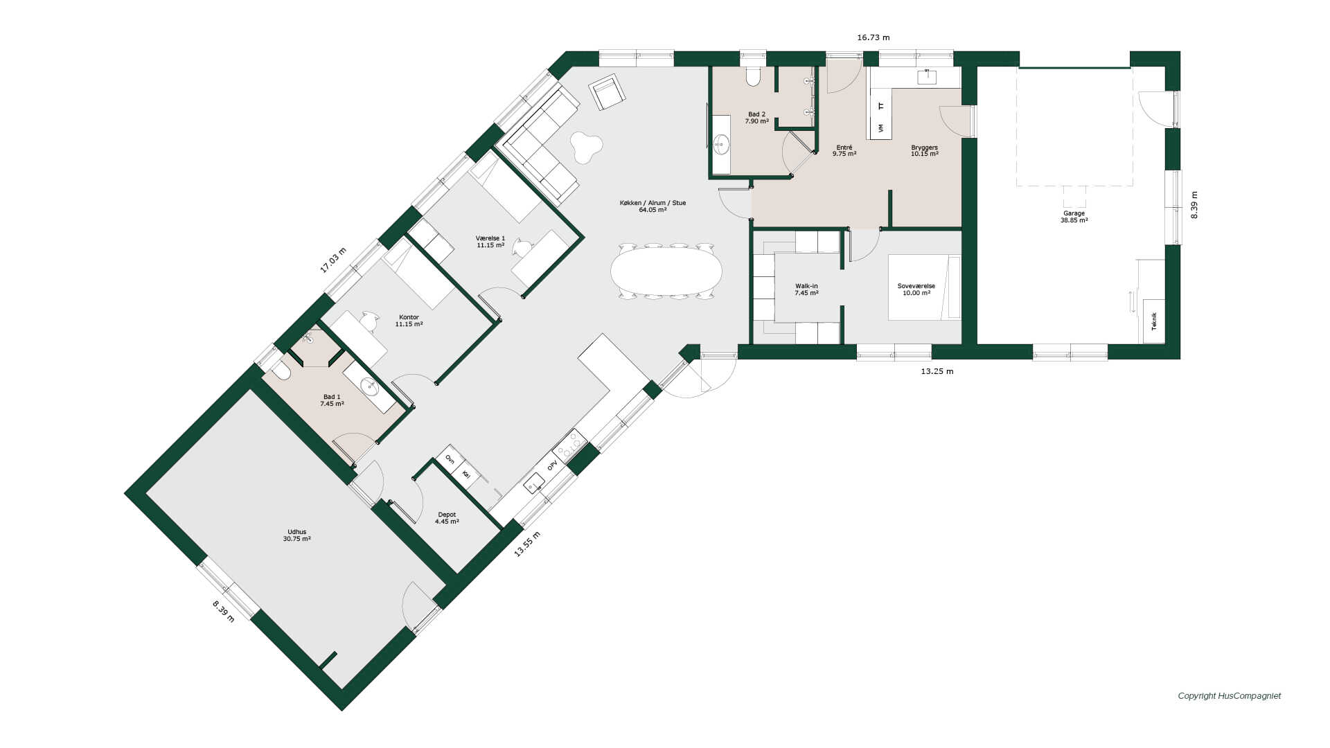 En anderledes indretning, hvor entréen er kombineret med bryggerset, hvorfra der er adgang til den integrerede garage. Ligeledes er der fra entréen adgang til soveværelset med tilhørende walk-in og stort badeværelse med dobbeltbrus, som således kan bruges af eksempelvis gæster, uden at de skal igennem soveværelset.