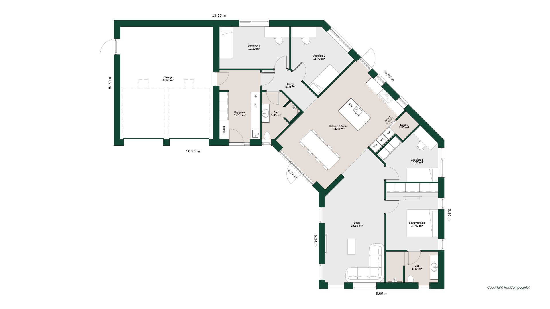 Dernæst kommer vi til det gennemgående køkken/alrum, hvor der er mulighed for udgang til begge sider, og hvor depotet med den skjulte indgang giver god plads til opbevaring. Den åbne forbindelse til stuen sikrer maksimal rumfølelse og åbenhed, så der skabes et naturligt flow imellem rummene.