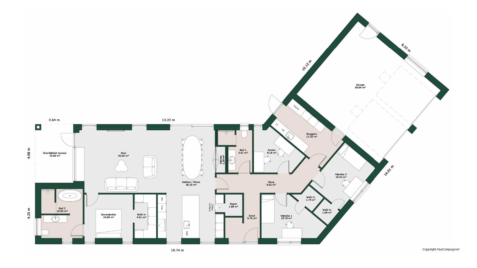 Dette knækhus er udstyret med en stor, integreret garage, hvorfra der er direkte adgang til husets bryggers. Herfra ledes man videre til værelsesafdelingen, hvor der er to gode børneværelser med hver deres walk-in closet – enhver teenagers drøm! Ligeledes findes i samme afdeling et kontor, badeværelse samt husets rummelige entré, der giver fin plads til at byde familiens gæster velkommen.
