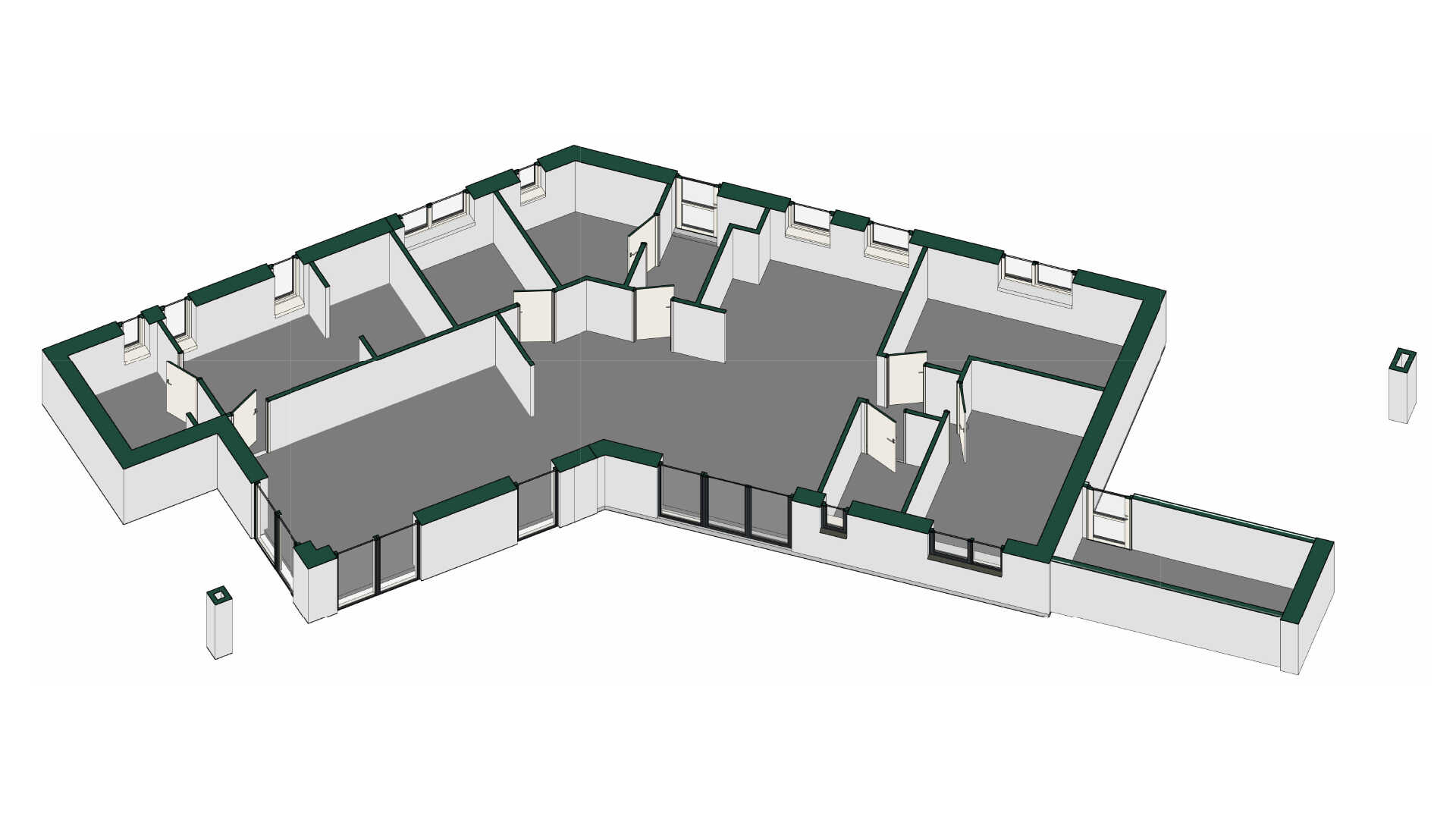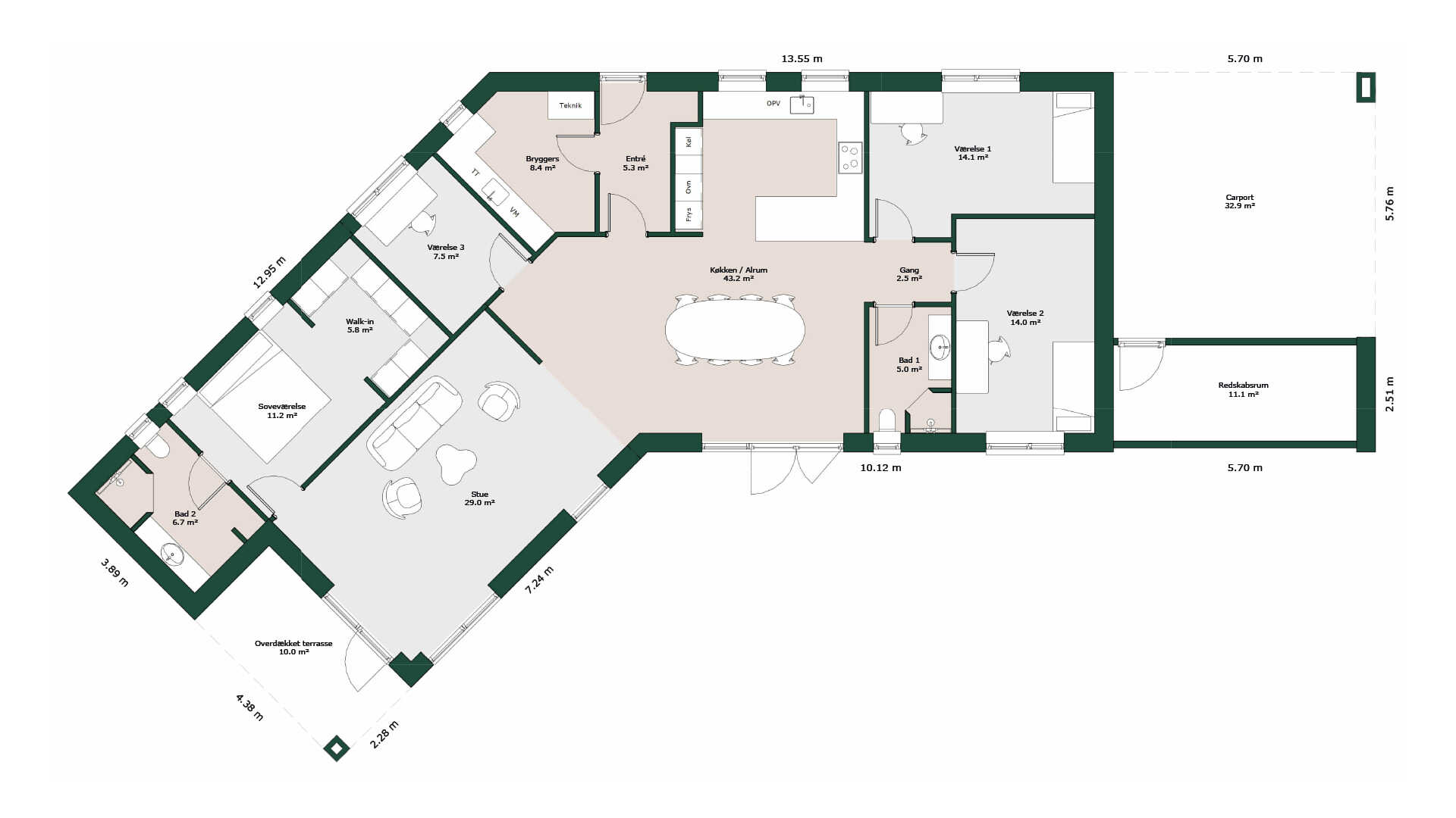 Store børneværelser i sin egen afdeling med tilhørende badeværelser og let adgang til køkken/alrummet, mens soveværelse med eget badeværelse og tilhørende walk-in er at finde i den anden ende af huset. Endelig findes husets tredje værelse, som også kan bruges til kontor, i direkte forbindelse til køkken/alrummet.