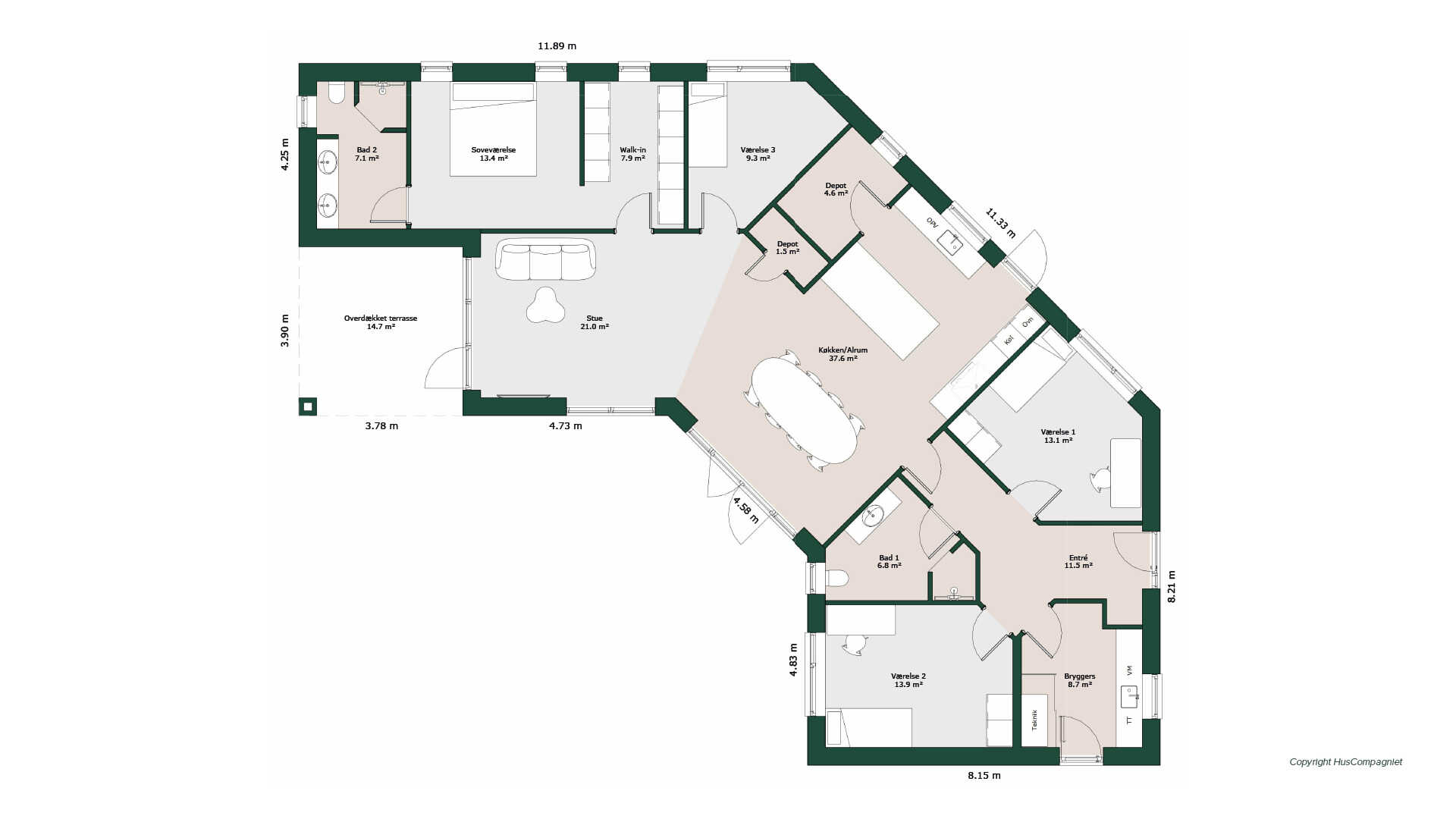 Det praktiske køkken/alrum med udgang til begge sider af huset indeholder ikke mindre end to rummelige depoter, hvor det ene kan bruges til opbevaring af køkkenmaskiner, konserves, mv., mens det andet eksempelvis kan indrettes til vin- eller kafferum.