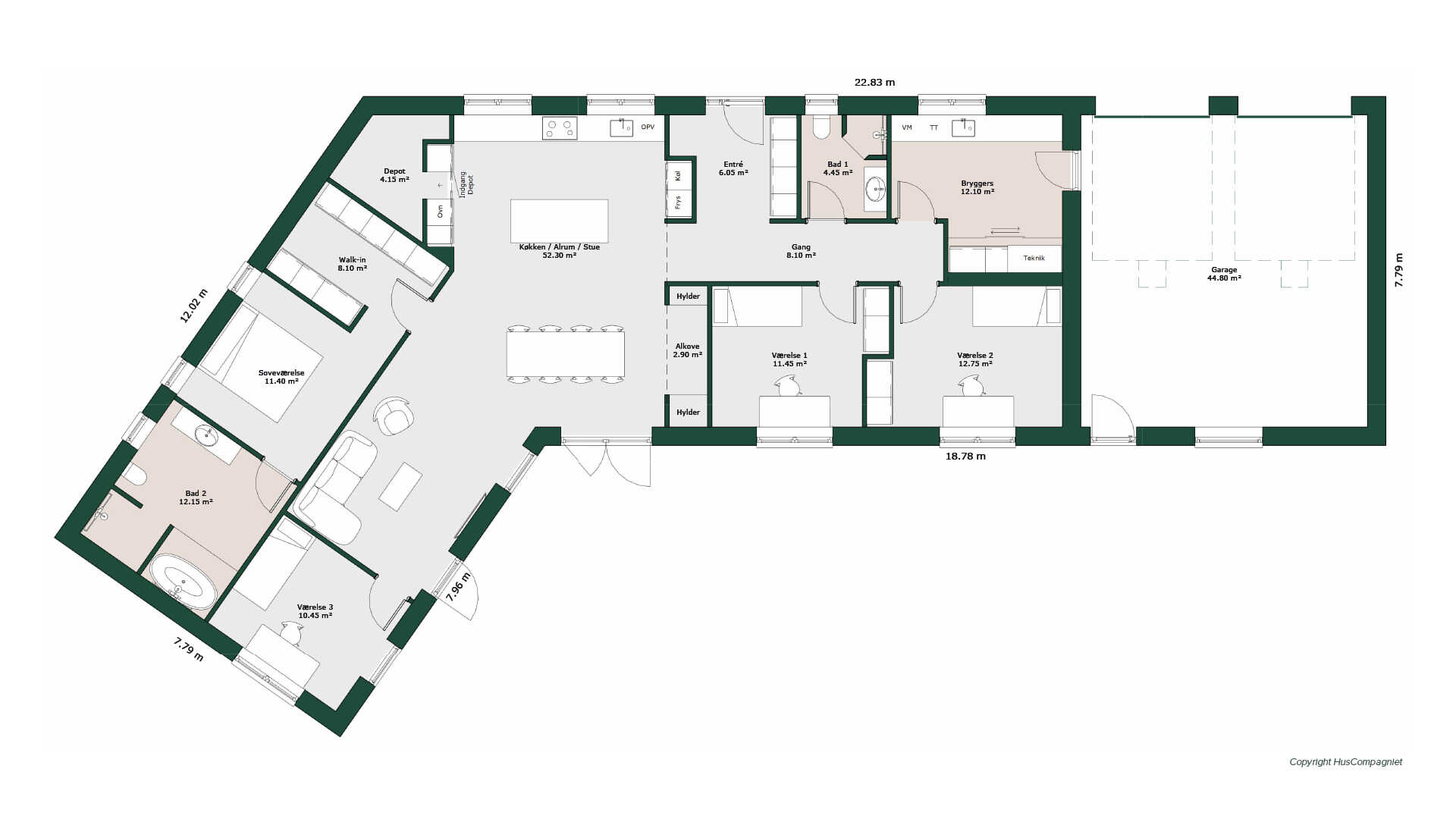 Derfra videre til værelsesafdelingen med 2 store børneværelser og eget badeværelse, forbundet af en rummelig gang, der fører os forbi entréen med masser af skabsplads og ind i køkken/alrummet, som ligger i åben forbindelse med stuen. Det praktiske depot med skjult indgang sikrer god opbevaringsplads, mens den hyggelige alkove giver rum til mange gode timer.