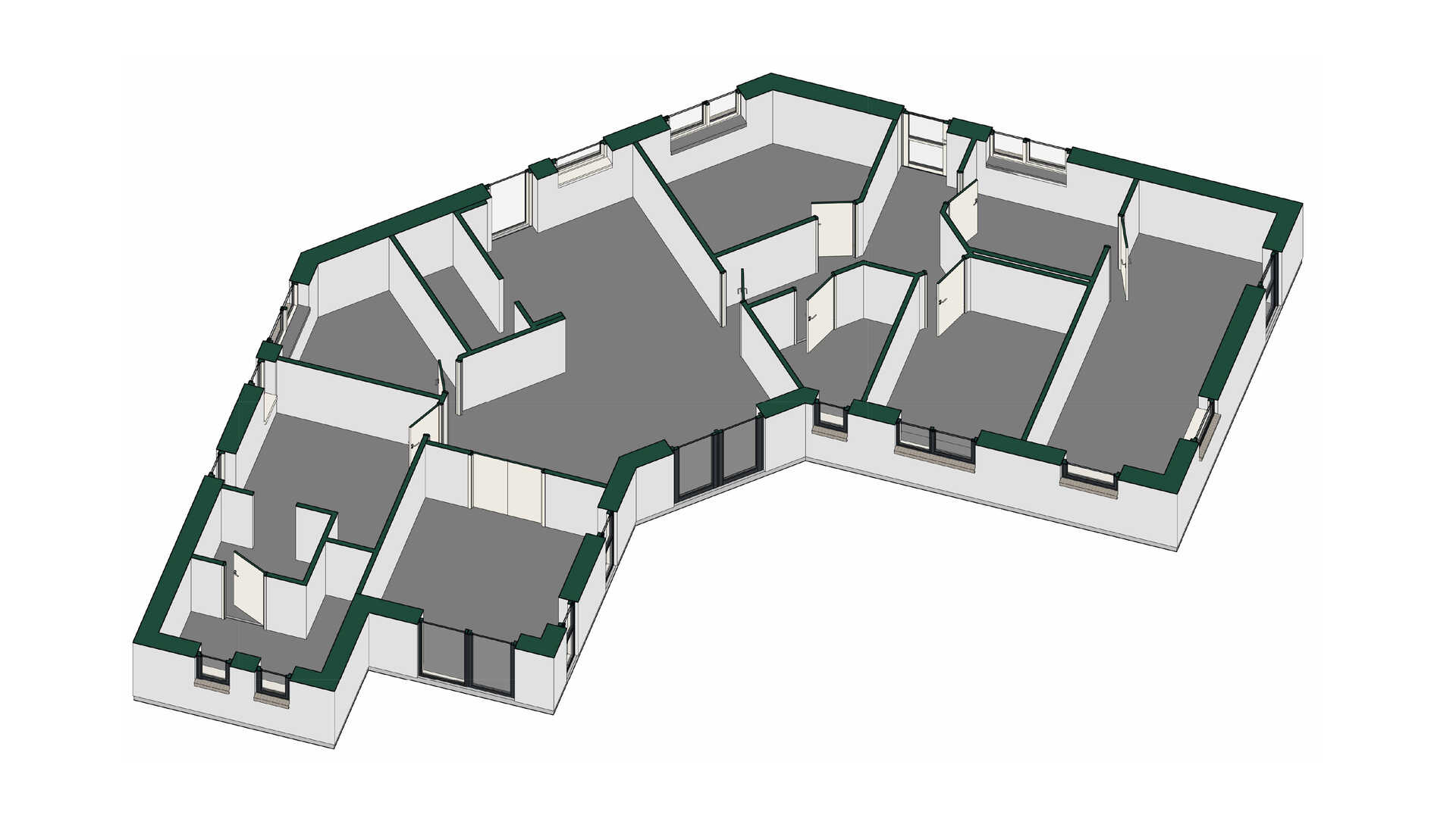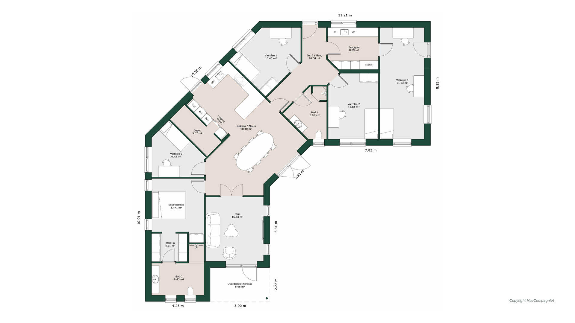 Her er plads til den store familie med hele tre store børneværelser og et mindre værelse. Forældreafdelingen rummer soveværelse, walk-in og badeværelse. Husets hjerte - køkken/alrummet har udgang til terrasser på begge sider af huset og har stort skjult depot. Den mindre, men hyggelige stue ligger godt skærmet med dobbeltdør mod alrummet og har udgang til overdækket terrasse. Husets knæk-form giver mulighed for at skabe gode hyggelige uderum med læ.