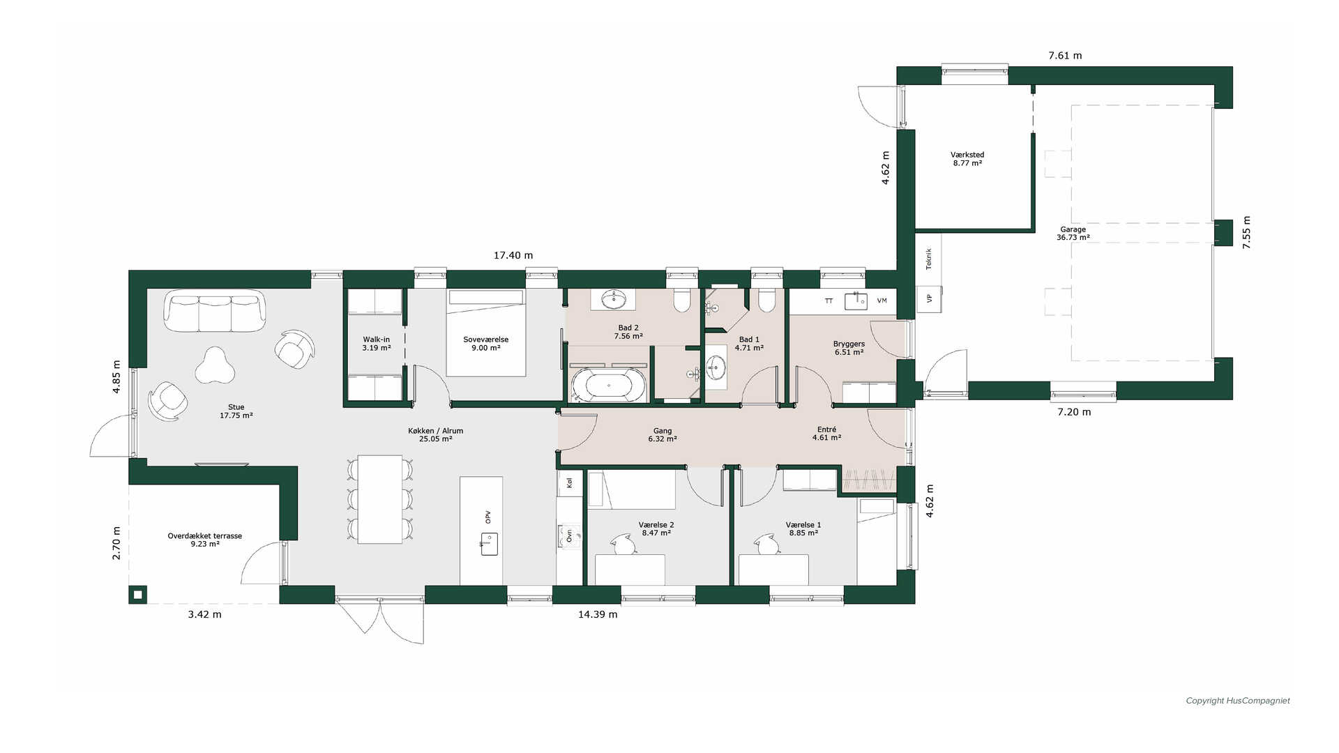 En hyggelig og optimeret planløsning med kun 125 m2 bolig. Det hyggelige køkken/alrum ligger i åben forbindelse med stuen og har udgang til den overdækkede terrasse. Voksenafdelingen rummer både på walk-in, mindre soveværelse og et lækkert badeværelse med både badekar og bruser. De to mindre værelser ligger separat og kan fungere som børneværelser til mindre børn. Her finder man også husets andet badeværelse og bryggers,
