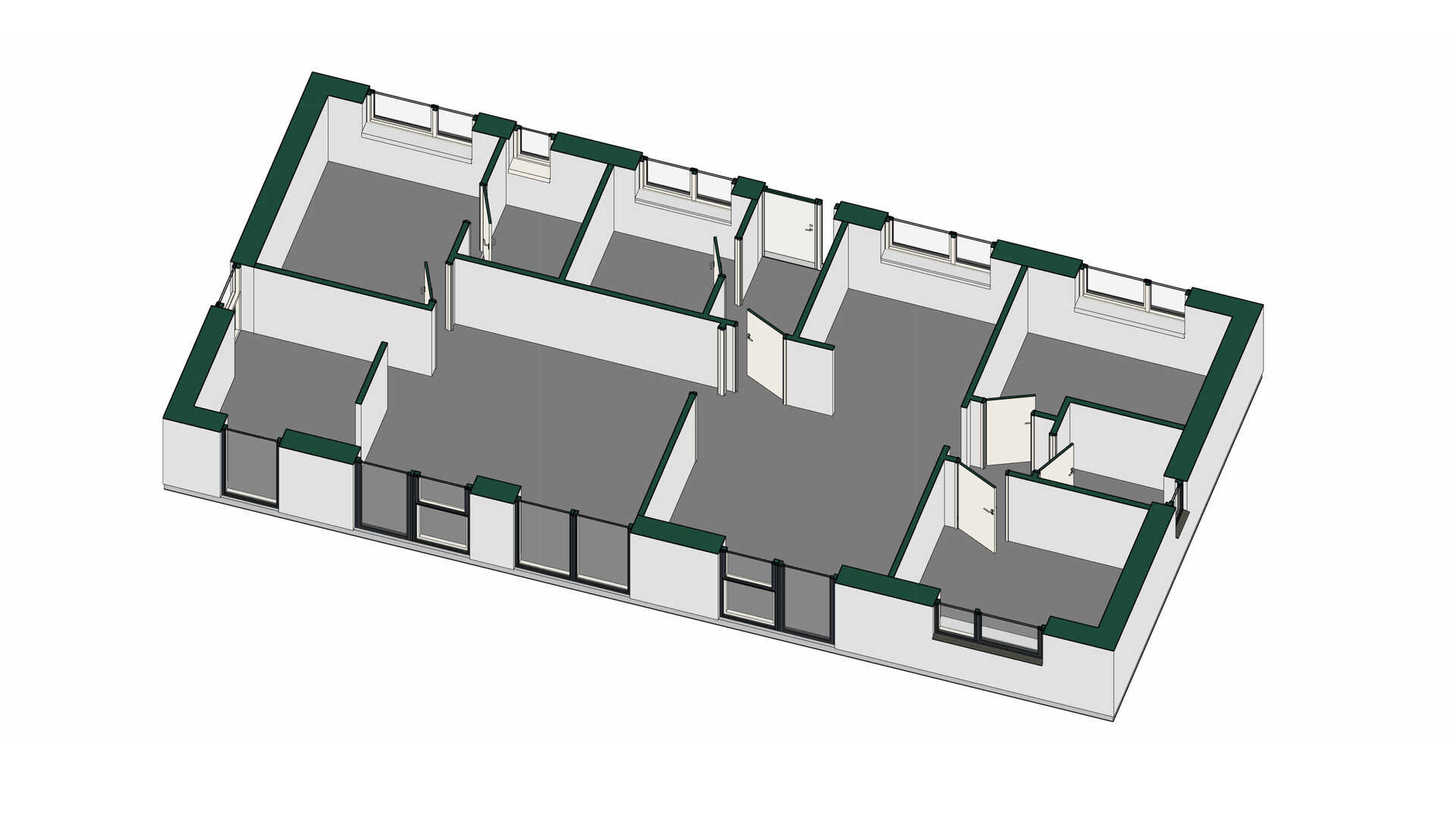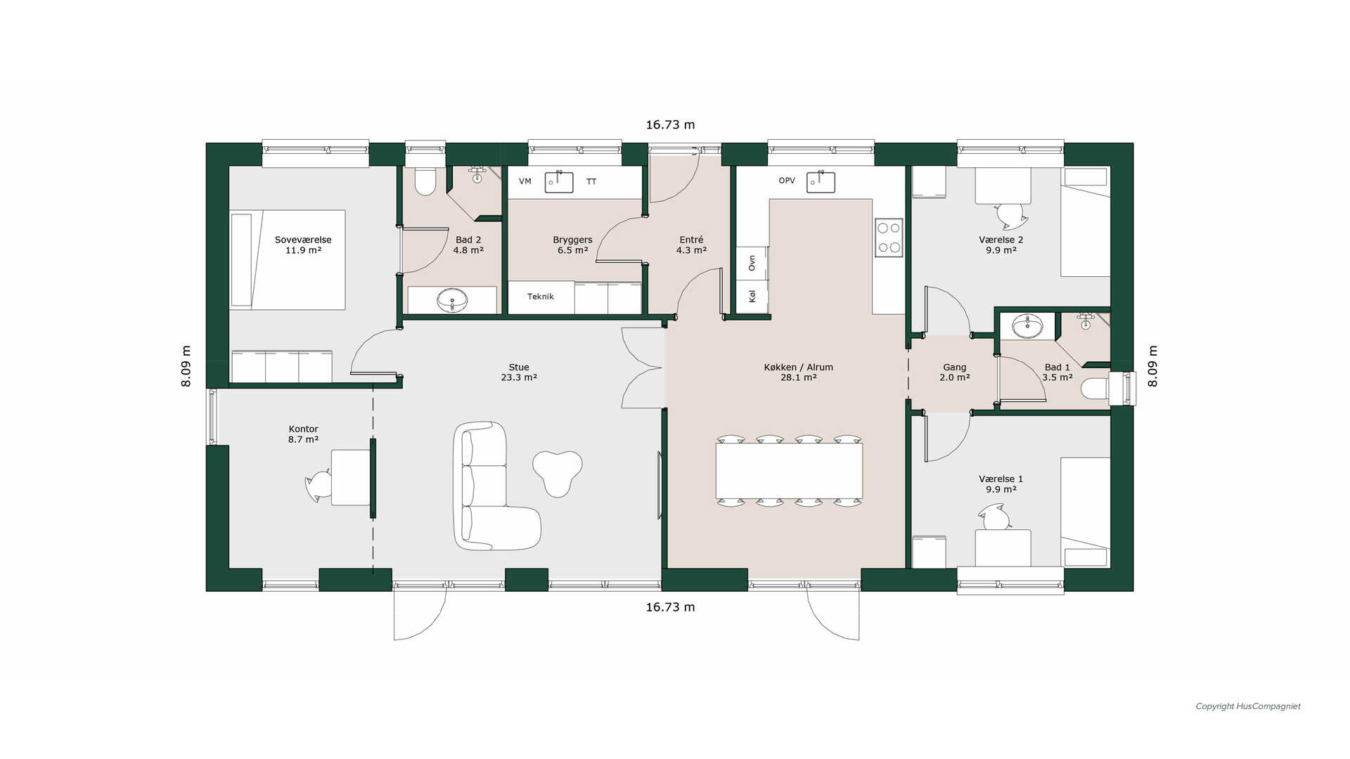 En rigtig fin løsning til den lille børnefamilie hvor huset rummer to børneværelse i separat værelsesafdeling med badeværelse. Køkken/alrummet har lysindfald fra to sider og udgang til terrasse. Stuen har udgang til terrasse og i forlængelse af stuen ligger åbent kontor afskærmet af en skillevæg. Forældreafdelingen rummer soveværelse med skabsvæg og badeværelse.