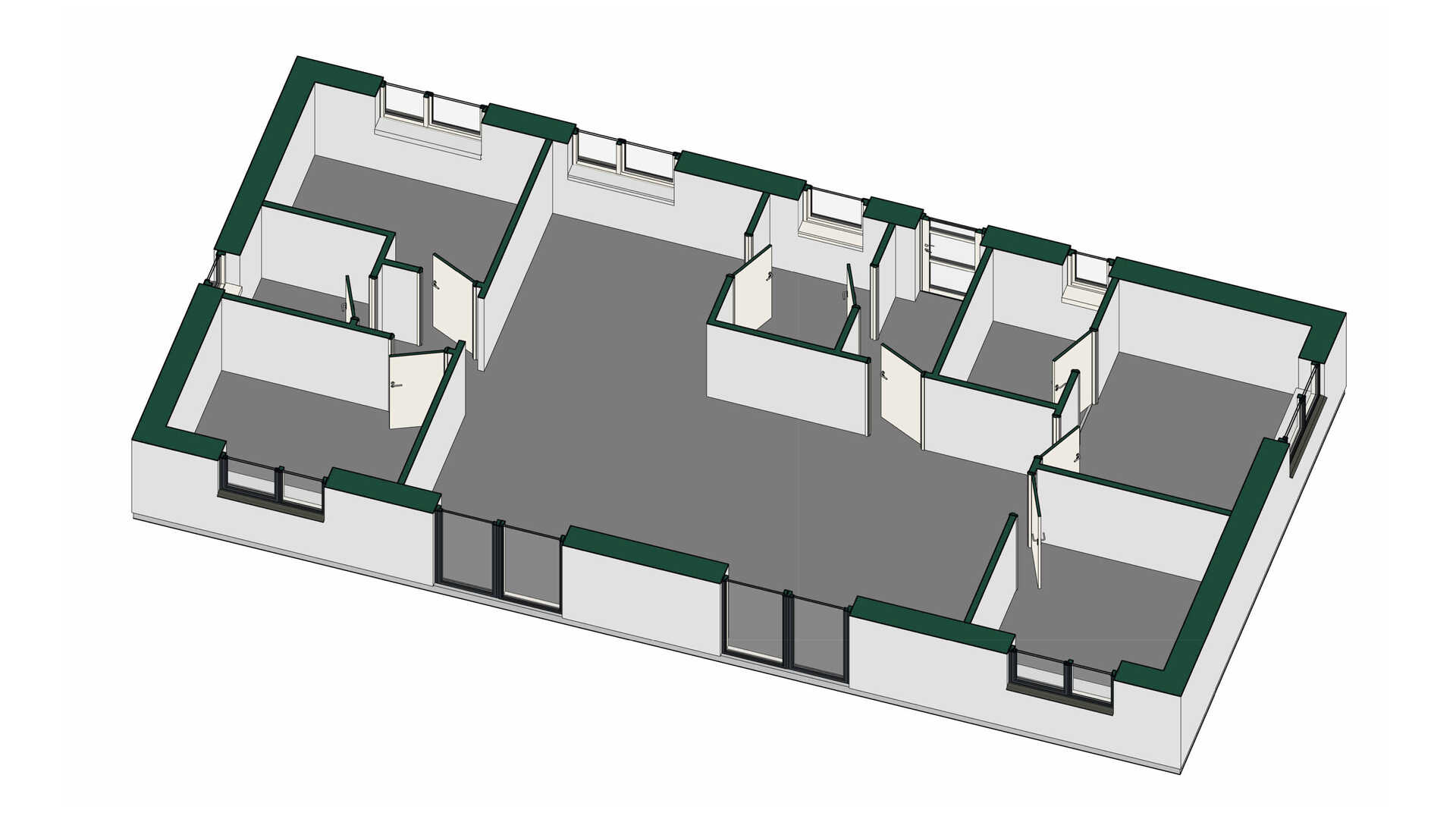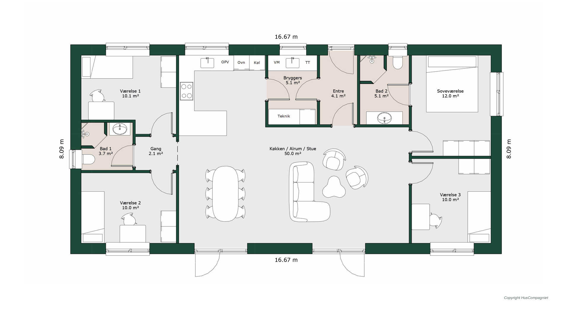 En planløsning hvor husets hjerte – det store køkken, alrum og stue i ét danner rammen om familielivet. Her er flere udgange til terrasser og lysindfald fra to sider. Separat børneafdeling med to gode børneværelser og badeværelse med bruser ligger i husets ene ende. I modsatte ende ligger husets forældresoveværelse med skabsvæg og badeværelse samt husets tredje børneværelseværelse.