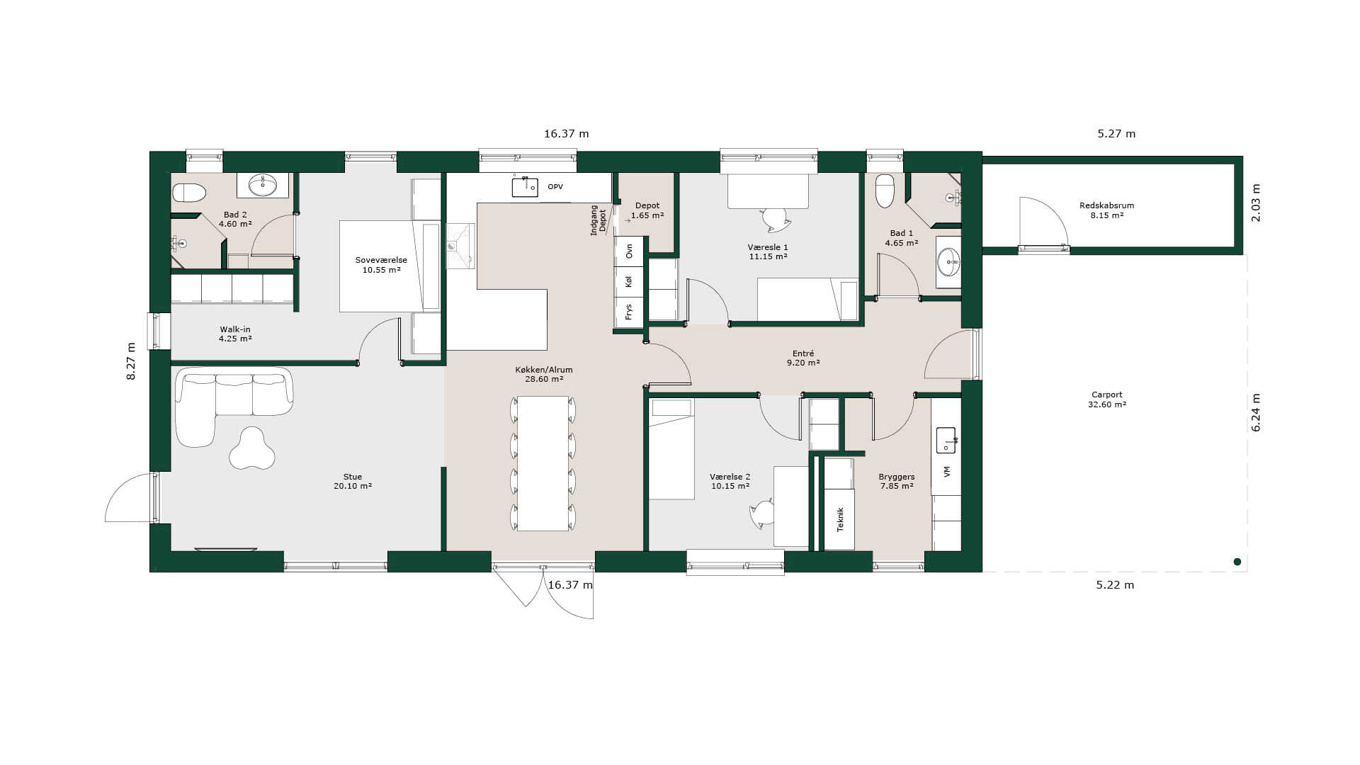 Stort bryggers, to gode værelser med indbyggede skabe. Lys entre og badeværelse. Gennemgående køkken/alrum med stort U formet køkken med skabsvæg hvor der gemmer sig det skjulte depotrum. Fra spisepladsen er der åbent ind til den hyggelige stue, og videre ind i voksenafdelingen, hvor der er et stort soveværelse med walk-in og eget badeværelse.