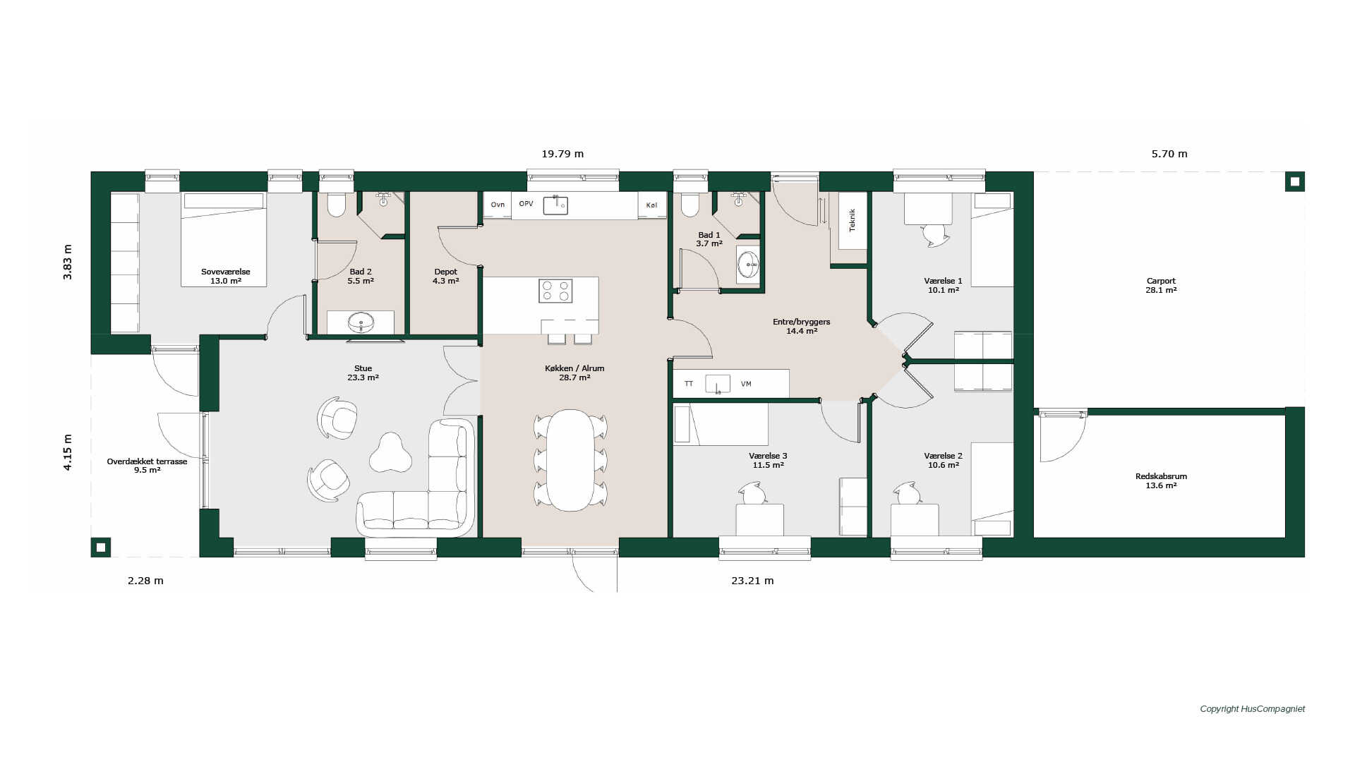 Man bliver budt velkommen i den store entre/bryggers. Her er der også adgang til tre gode børneværelser samt eget badeværelse. Dejligt gennemgående køkken/alrum med godt lysindfald fra begge sider. Stort depot. Fransk dør til den hyggelige stue, hvor der er udgang til den overdækkede terrasse. Husets soveværelse giver også udgang til den overdækkede terrasse.