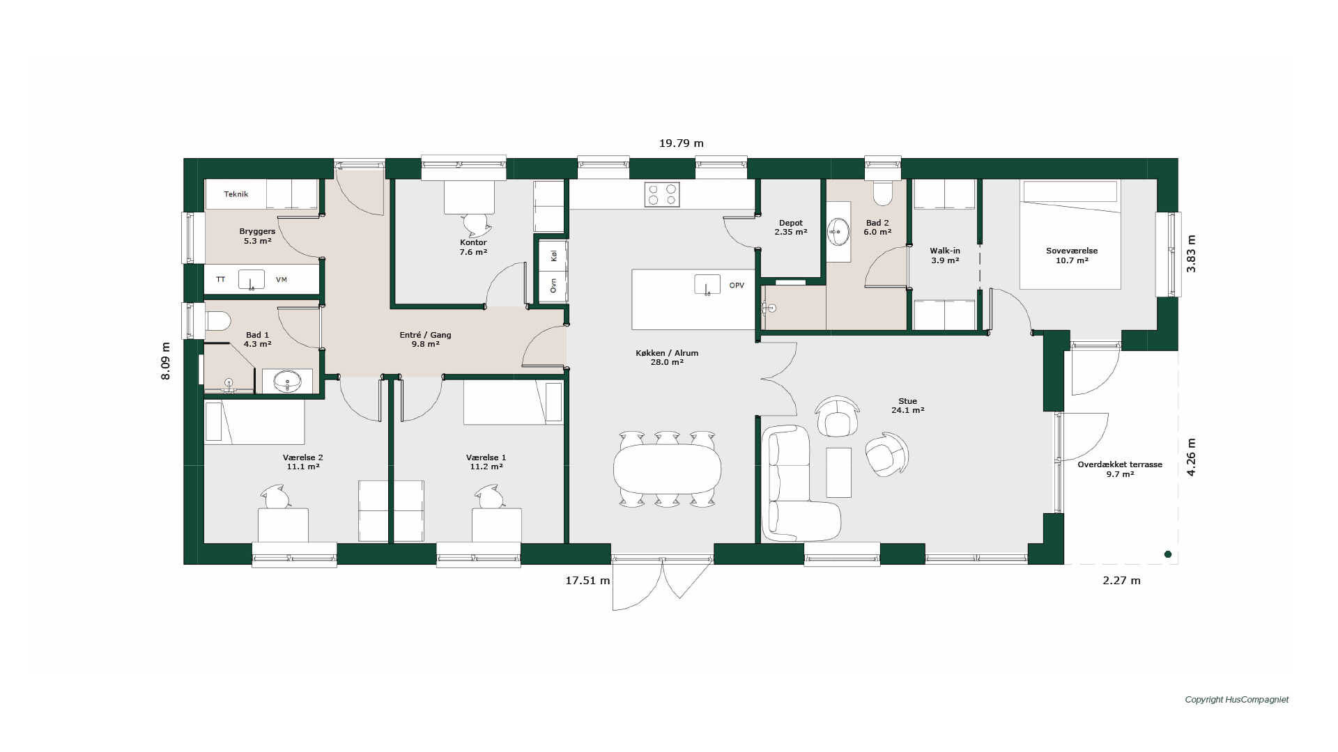 Fra entréen kommer man ind til to gode børneværelser samt et godt kontor, og tilhørende bad. Dejligt gennemgående køkken/alrum med vaske-ø og depotrum. Fransk dør til stuen og forældreafdeling med soveværelse og walk-through til et lækkert badeværelse. Fra stue og soveværelse er der udgang til den overdækkede terrasse.