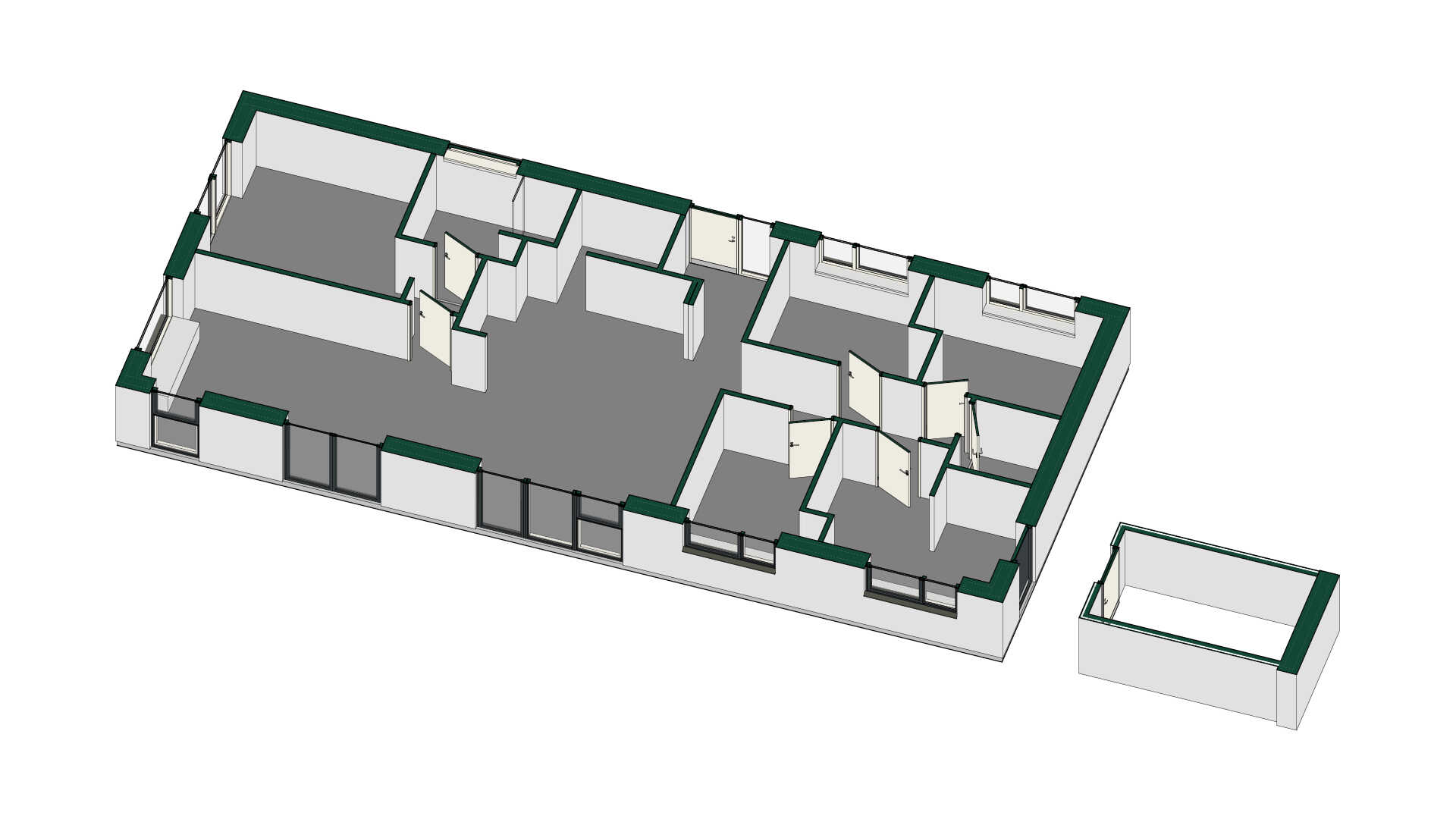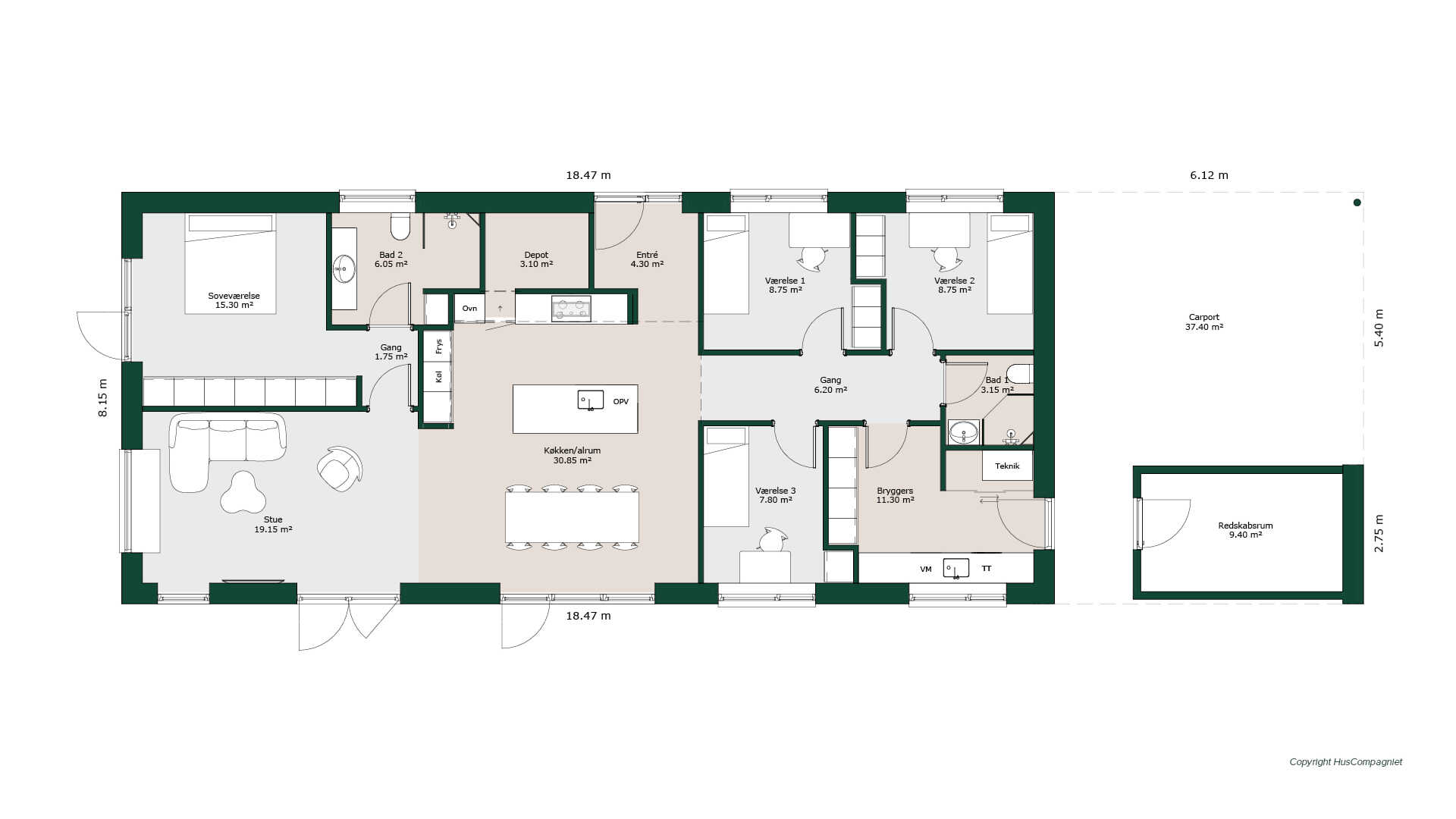 Opbevaring er nøgleordet i denne plantegning. Her er vægten lagt i det store åbne køkken/alrum, hvor der er masser af både lys og opbevaring, dels via de mange skabe og dels via det skjulte depotrum. Køkkenet/alrummet er det centrale rum I huset, hvorfra der er adgang til stue med sansevindue, og videre herfra ind til det store rummelige soveværelse med mange indbyggede skabe og badeværelse. I den modsatte ende er børneafdelingen med hele tre værelser, alle med indbyggede skabe. Eget bad og stort bryggers som igen er med indbyggede skabe.
