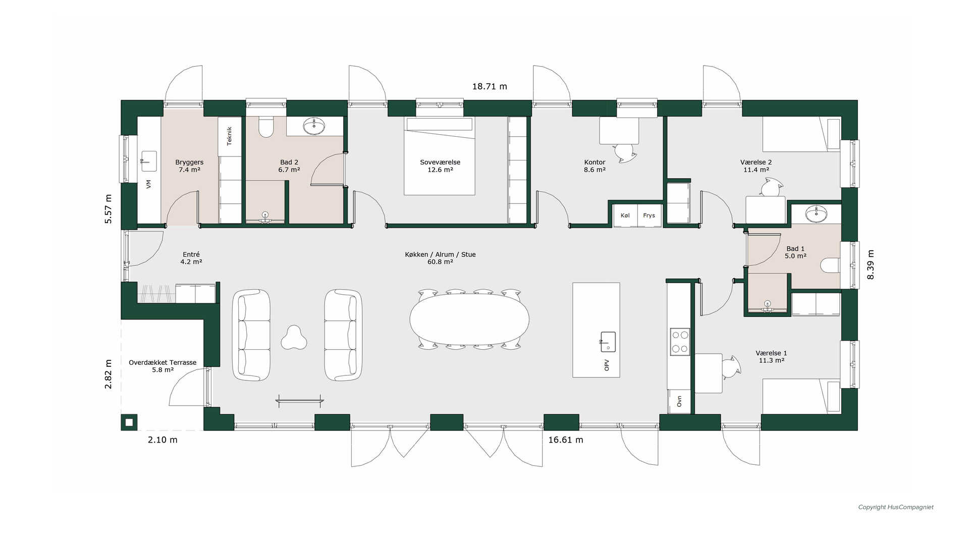 Her får man det lange kig fra indgangsdør til husets anden ende - helt klassisk for det populære længehus. Her får man to store børneværelser med badeværelse i separat afdeling, et mindre kontor og godt bryggers, Det store køkken, alrum og stue i ét har masser af lysindfald og udgang til både en lille overdækket terrasse og mulighed for at lade terrassedørene stå åbne, så inde og ude flyder sammen.
