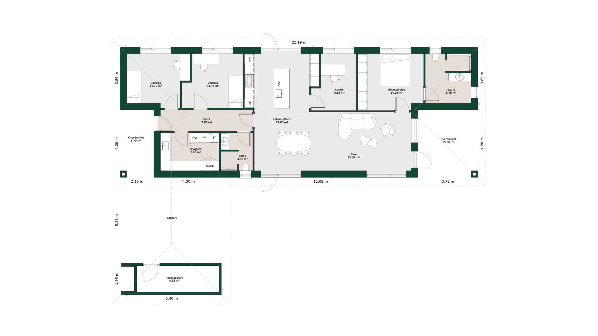 Her er der fokus på at få mest muligt ud af hver eneste kvadratmeter ud fra princippet om at få ”mere for mindre”. Huset rummer hele 4 værelser, her i blandt forældreafdeling med soveværelse samt eget bad, køkken/alrum med åben forbindelse til stue, rummelig entre og stort bryggers samt ekstra badeværelse. Fra stuen er der udgang til en skøn overdækket terrasse og de store vinduespartier sikrer et godt lysindfald.