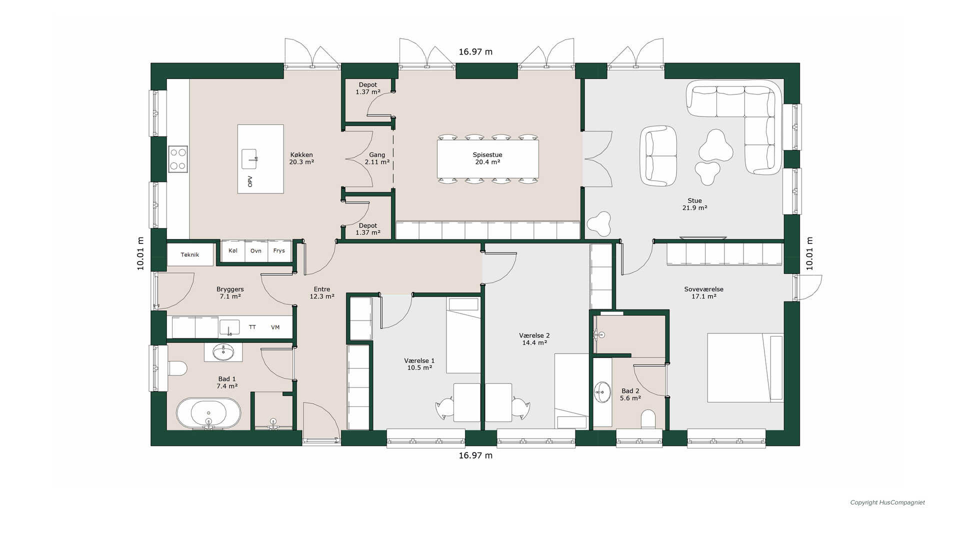 Her byder planløsningen på det lange kig fra køkkenøen. Her er både køkken og spisestue opdelt af dobbeltdøre og dermed en mere klassisk rumfordeling. Der er overalt lagt vægt på masser af opbevaringsplads som depotrum og gode skabsløsninger, så her går man ikke ned på skabsplads. Forældreafdelingen rummer stort soveværelse med skabsvæg og badeværelse. Børneafdelingen rummer to store værelser og har adgang til stort badeværelse med både bruser og badekar.