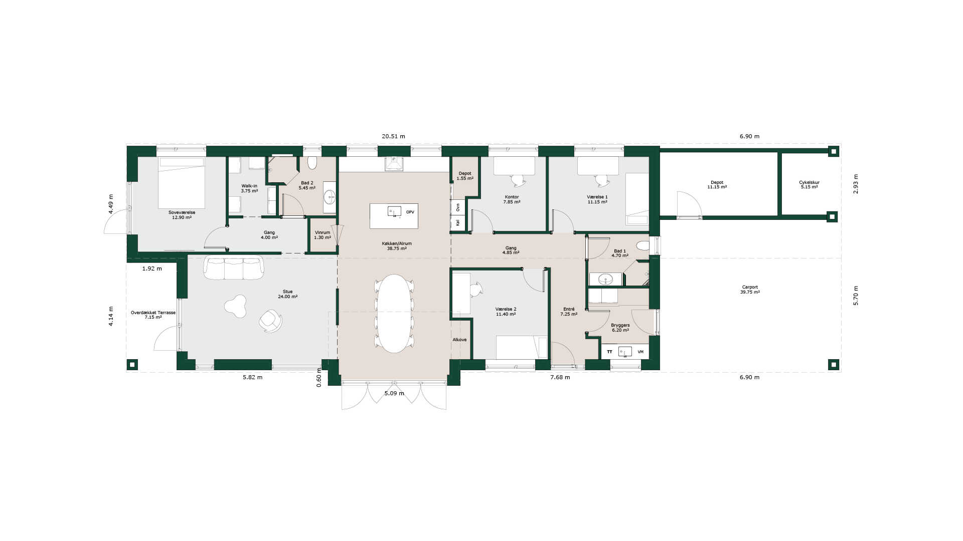 Boligen indeholder stort køkken/alrum med køkkenø og adgang til både vinrum og depot.