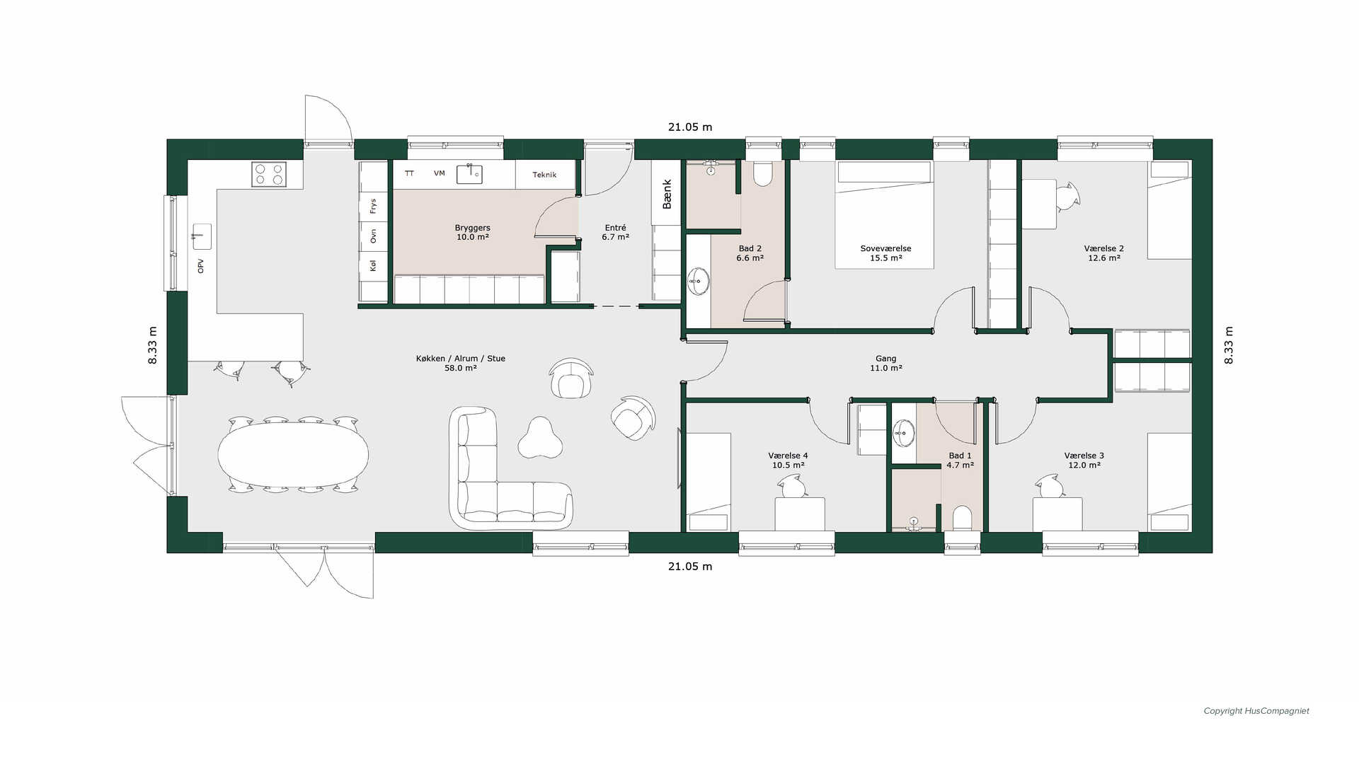 Her får man en planløsning hvor opbevaring er tænkt ind i alle rum. Det store bryggers ligger lige i forbindelse med entréen. Her er tænkt opbevaring ind i begge rum i form af skabe og garderobeløsning. Husets værelsesafdeling rummer et stort soveværelse med skabsvæg og badeværelse, to store børneværelser og et mindre børneværelse – alle med skabe. Leverummet er det store kombinerede køkken, alrum og stue med godt lysindfald og flere udgange til terrasser.