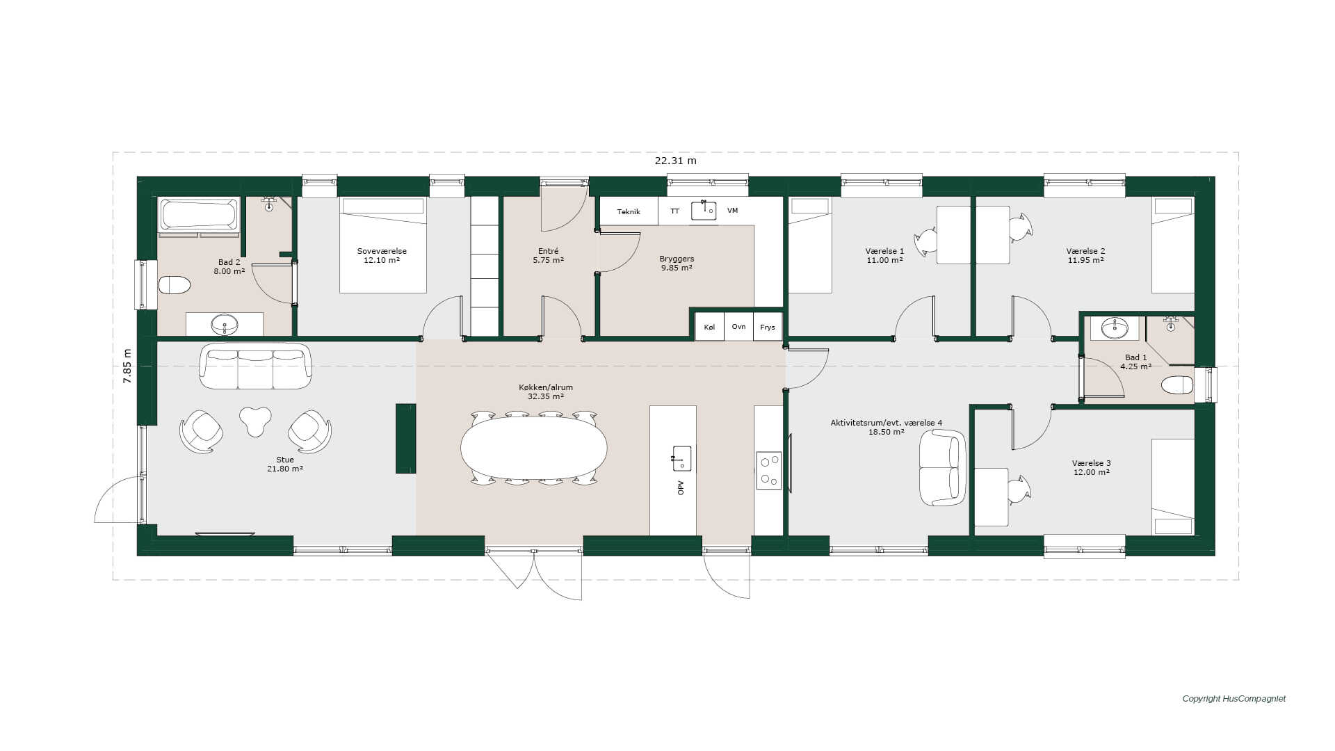 Den traditionelle længeindretning sikrer den absolut bedste økonomi. Men derudover har den også meget andet godt at byde på. Her er længen udnyttet i en moderne indretning med fokus på store, åbne fællesrum og masser af adgang til havens solside.