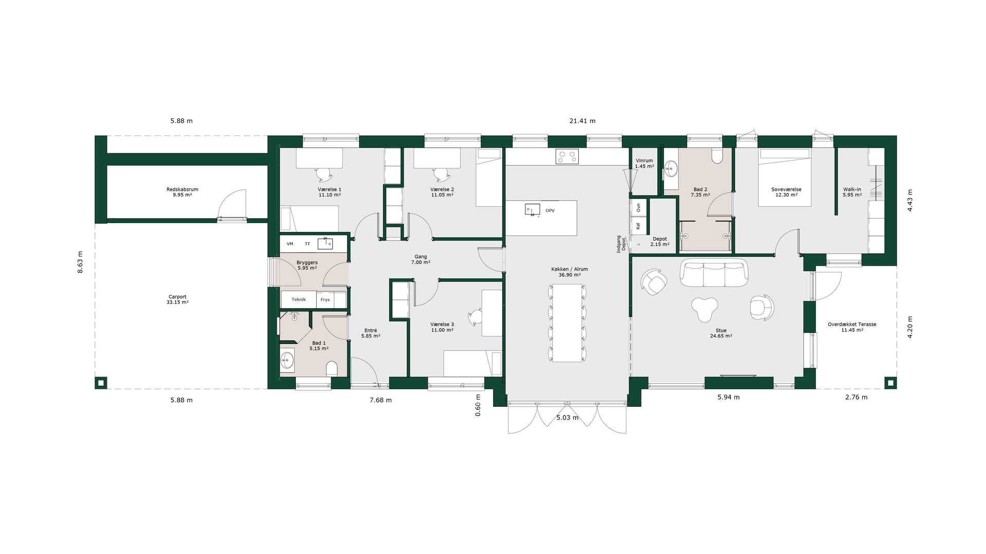 Huset byder på dejlig store og funktionelle rum med vægt på det gode lysindfald. Gode store børneværelser. Herudover et fedt indrettet køkken/alrum med tilhørende vinrum og depotrum. Stuen ligger i åben forbindelse med alrummet og har udgang til overdækket terrasse.