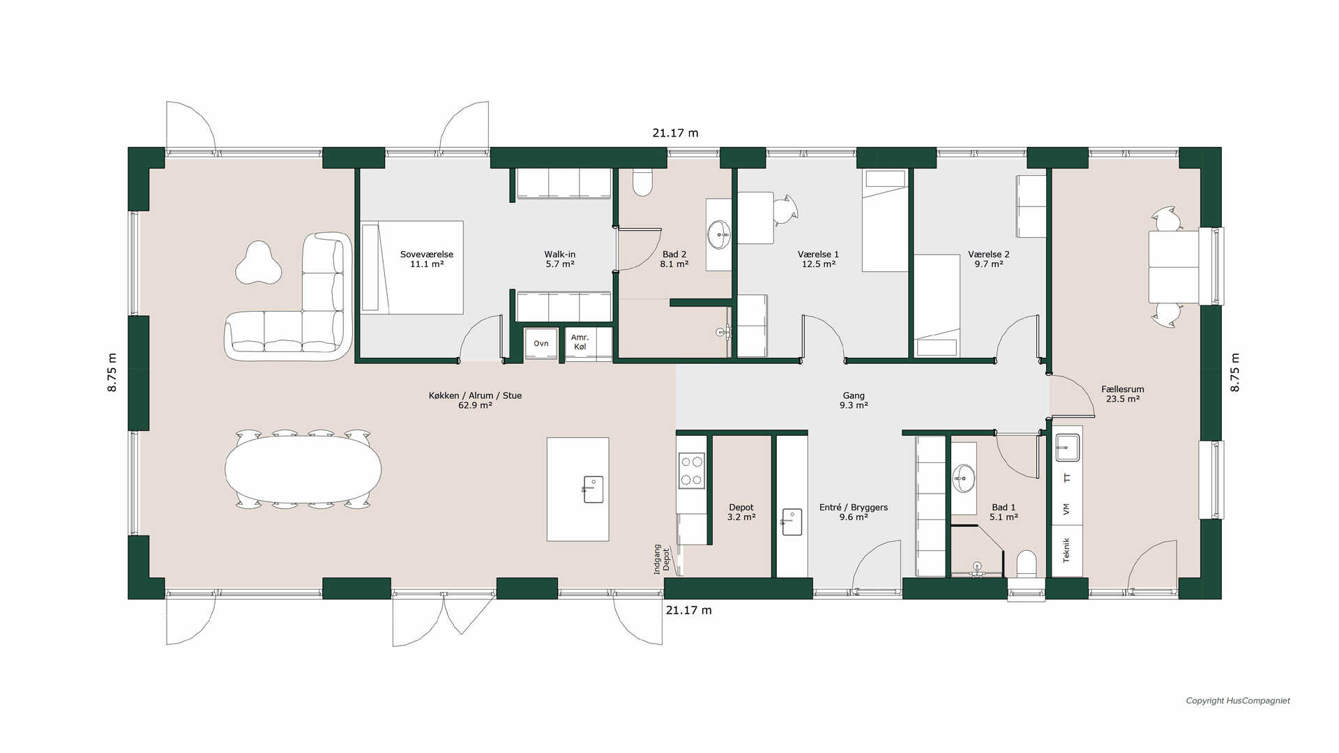 Husets absolutte hjerte – det store køkken/alrum, der ligger i åben forbindelse med stuen giver rig mulighed for samvær. Her er der stort praktisk depot og flere udgange til husets terrasser. Derudover rummet planløsningen et stort fællesrum, hvor kun fantasien sætter grænser for udnyttelsesmulighederne. Forældreafdelingen er rummelig med walk-through og badeværelse. Den kombinerede bryggers/entré har masser af plads og gode opbevaringsmuligheder. Der er et stort børneværelse og et mindre værelse, der både kan bruges som babyværelse eller kontor/gæsteværelse.