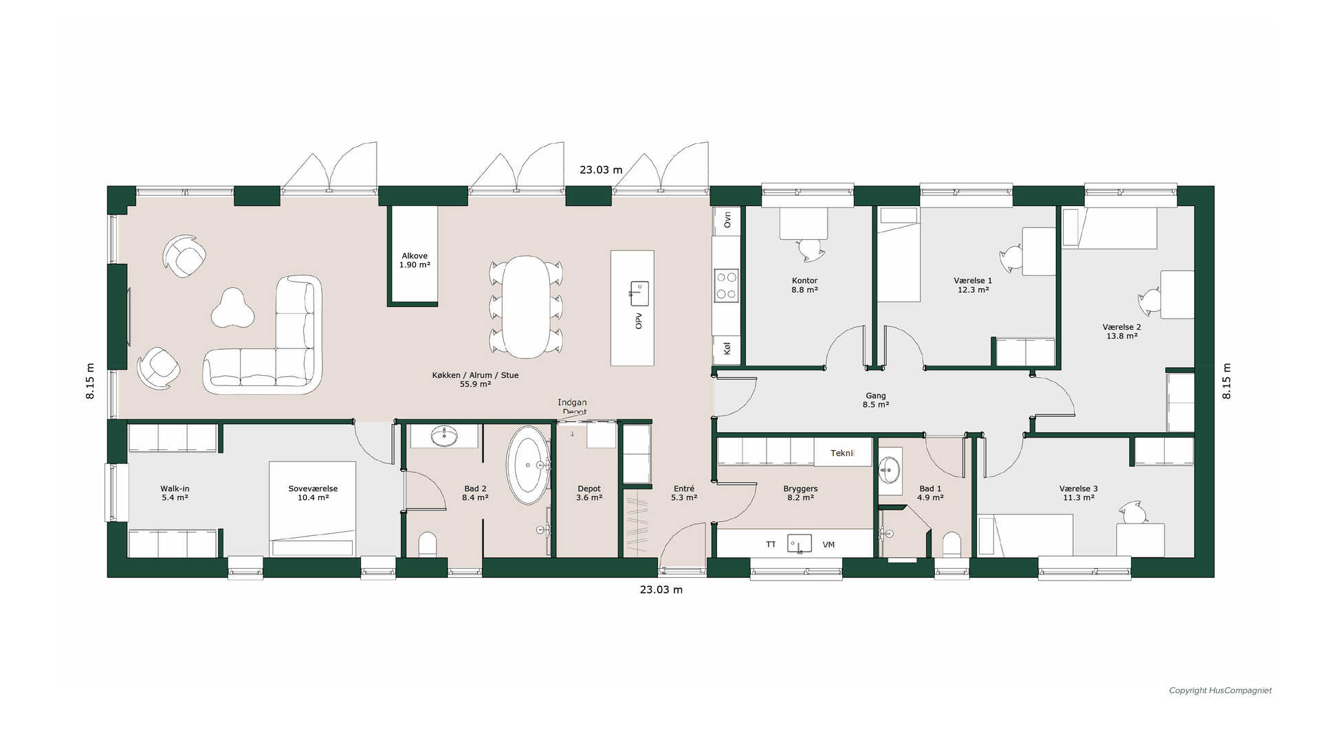 Denne planløsning rummer separat børneafdeling med tre store værelser, badeværelse og mindre kontor/gæsteværelse. Husets indgang ligger praktisk i forbindelse med bryggerset og har plads til garderobe og opbevaring. Den lækre forældreafdeling har stort åbent walk-in i soveværelset og lækkert badeværelse med både badekar og bruser. Husets hjerte - køkken/alrummet byder på hele to udgange til terrassen og en hyggelig alkove. Stuen ligger i åben forbindelse med alrummet, men alkovens placering giver en god opdeling af rummene.