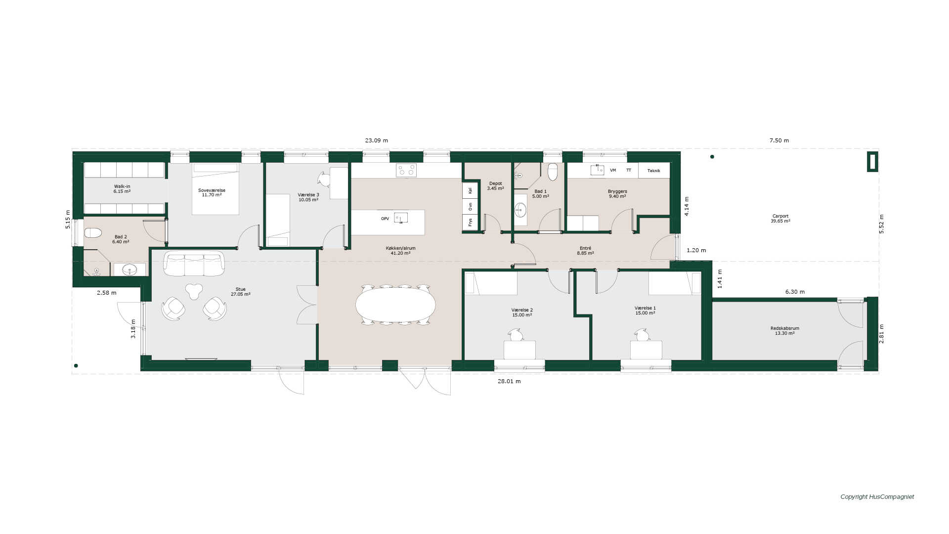 En nutidig indretning til den pladskrævende familie. En skøn forældreafdeling med stort walk in, soveværelse og badeværelse. Huset byder på to store børneværelser med tilhørende badeværelser og et mindre værelse. Der er fokus på praktik og opbevaringsplads - her er masser af plads i både bryggers og depot.