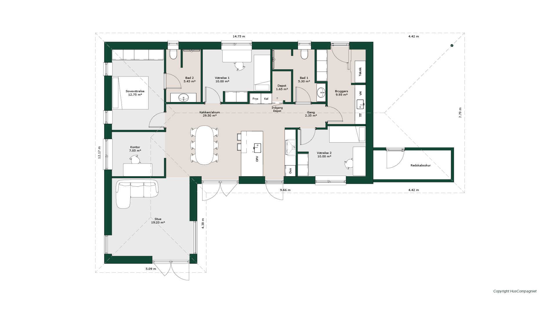 En rigtig fin planløsning hvor pladsen er optimeret med en indgang til et stort og praktisk bryggers.