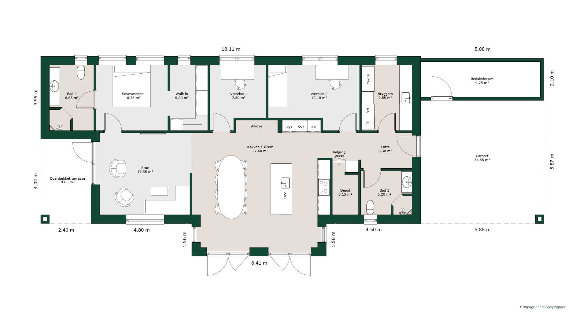 Vinkelhus eller T-hus på 145 m2 med dobbelt carport og redskabsrum. Stort lyst køkken-alrum med plads til gæster og langbord. Dejlig alkove-skabsniche samt depotrum. Stor bred entre med byggers samt stort badeværelse. Stort børeneværelse på 12 m2, samt kontor eller 2 børneværelser på 10 m2. Hyggelig stue med udgang til overdækket terrasse. Soveværelsesafdeling med walk-in og dejligt badeværelse