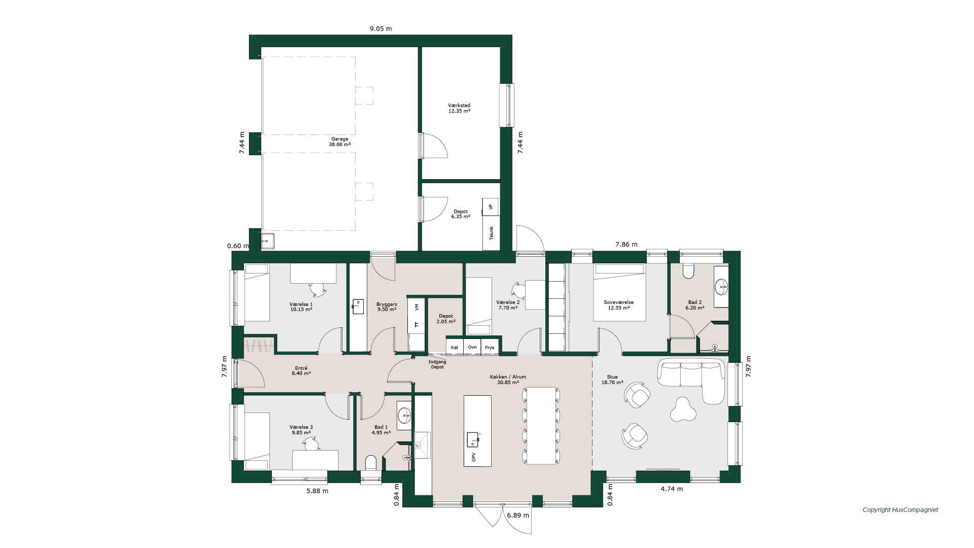 Lækker planløsning med børneafdeling med to gode børneværelser med eget badeværelse og separat indgang. Køkken/alrum er husets hjerte, hvorfra der er adgang til et ekstra værelse samt åben forbindelse til stuen. Opbevaringsplads er der rigelig af i form af et nyttigt depot både i køkken og i forbindelse med garagen hvor man også finder et praktisk værksted.