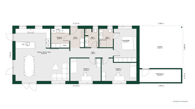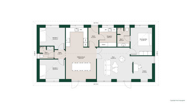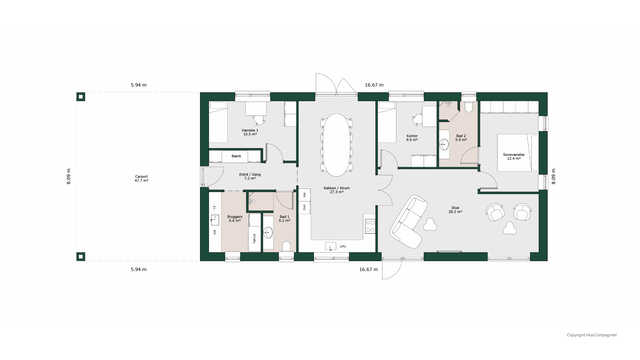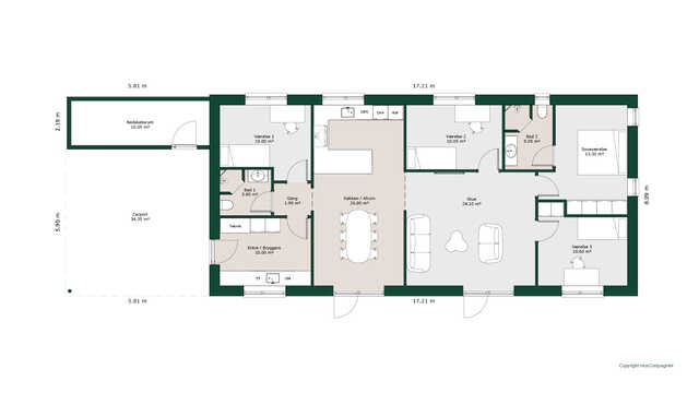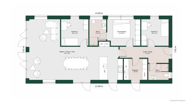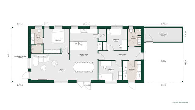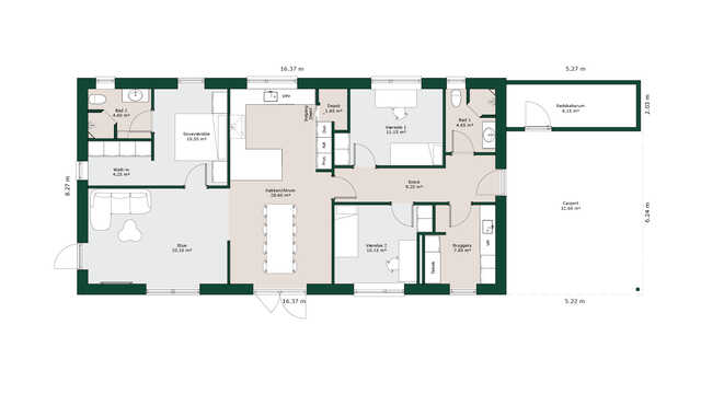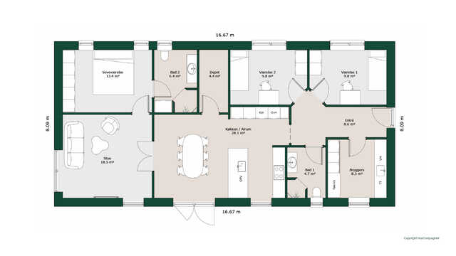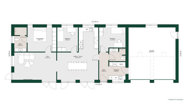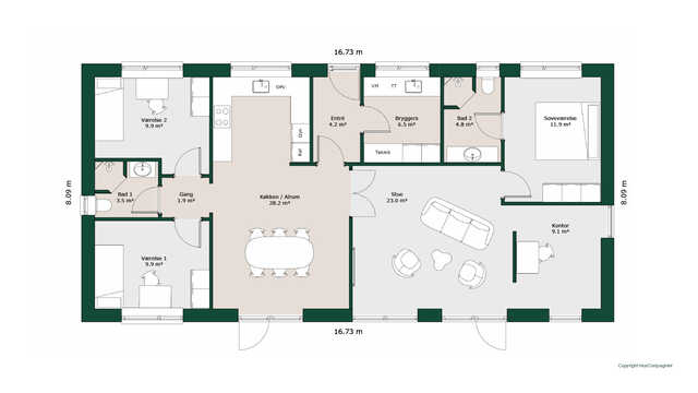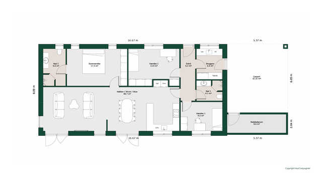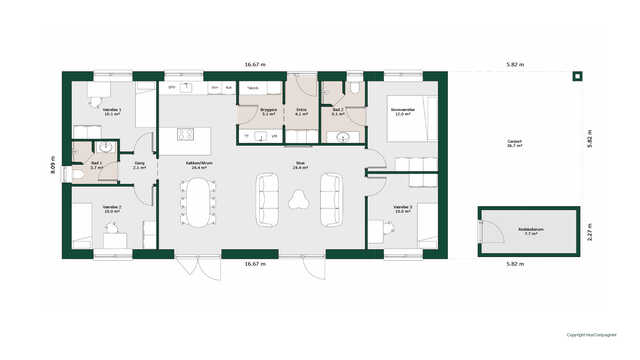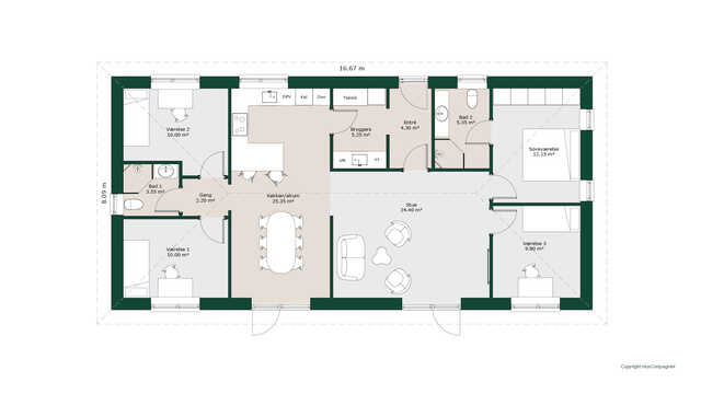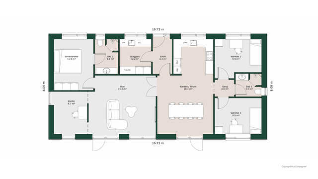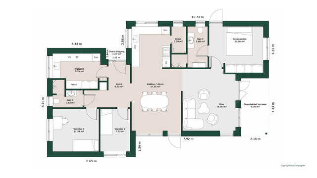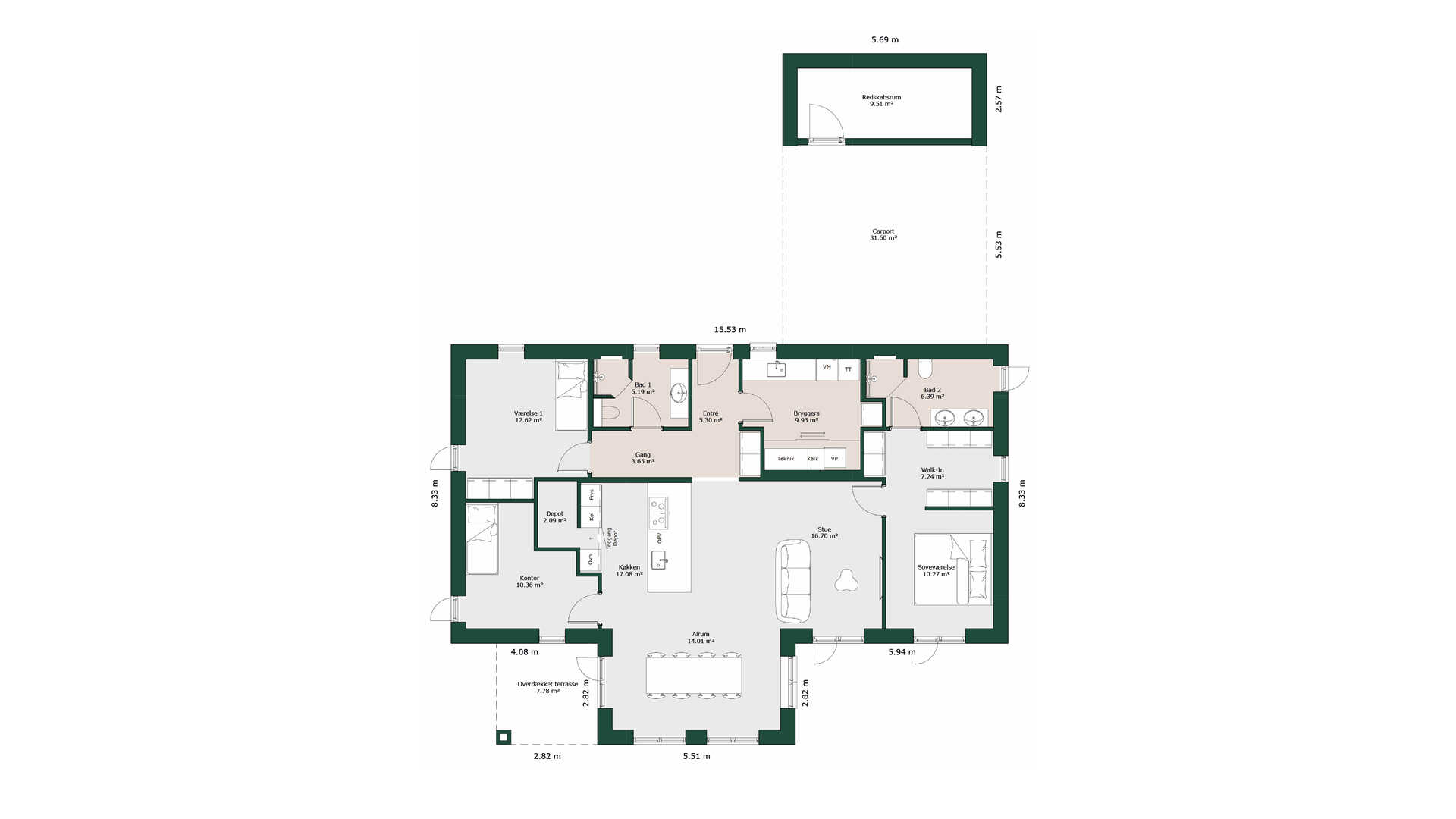 Med fokus på det store køkken/alrum i åben forbindelse med stuen, er der her naturlig opdeling mellem husets funktioner. I køkken/alrummet er der stort depot med gode opbevaringsmuligheder, udgang til overdækket terrasse og masser af lysindfald.