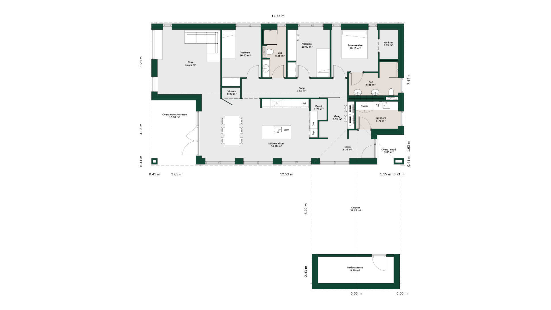 Store vinduespartier giver et godt lysindfald og bemærk hvordan den store carport leder direkte til overdækket indgangsparti.