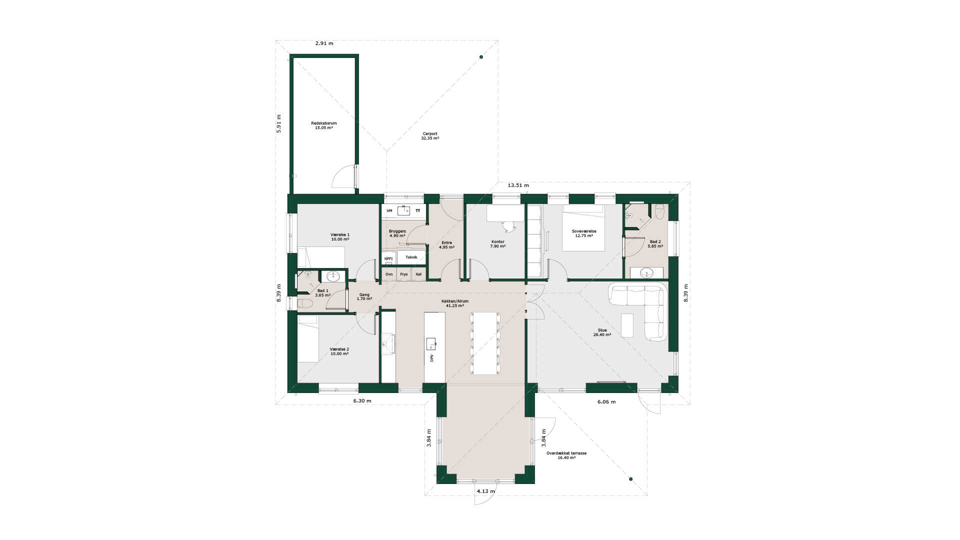 De 154 m2 er optimal indrettet hvor du har tørskoet indgang via den integrerede carport til husets entré.