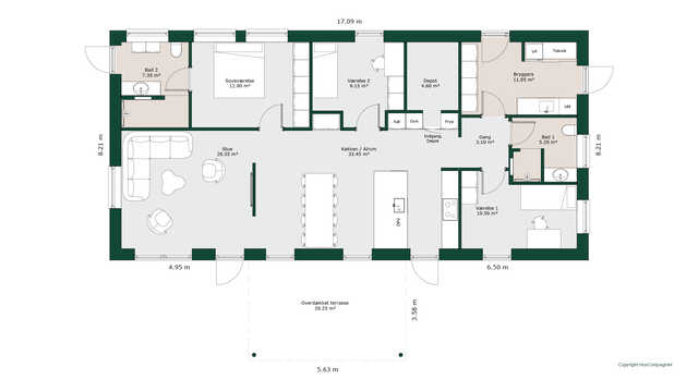 Åbenhed, lys og ”det levende rum” er i fokus i denne indretning. Her er der plads til familiesamvær i husets køkken/alrum med åben forbindelse til stuen, og med adgang til den store overdækkede terrasse.