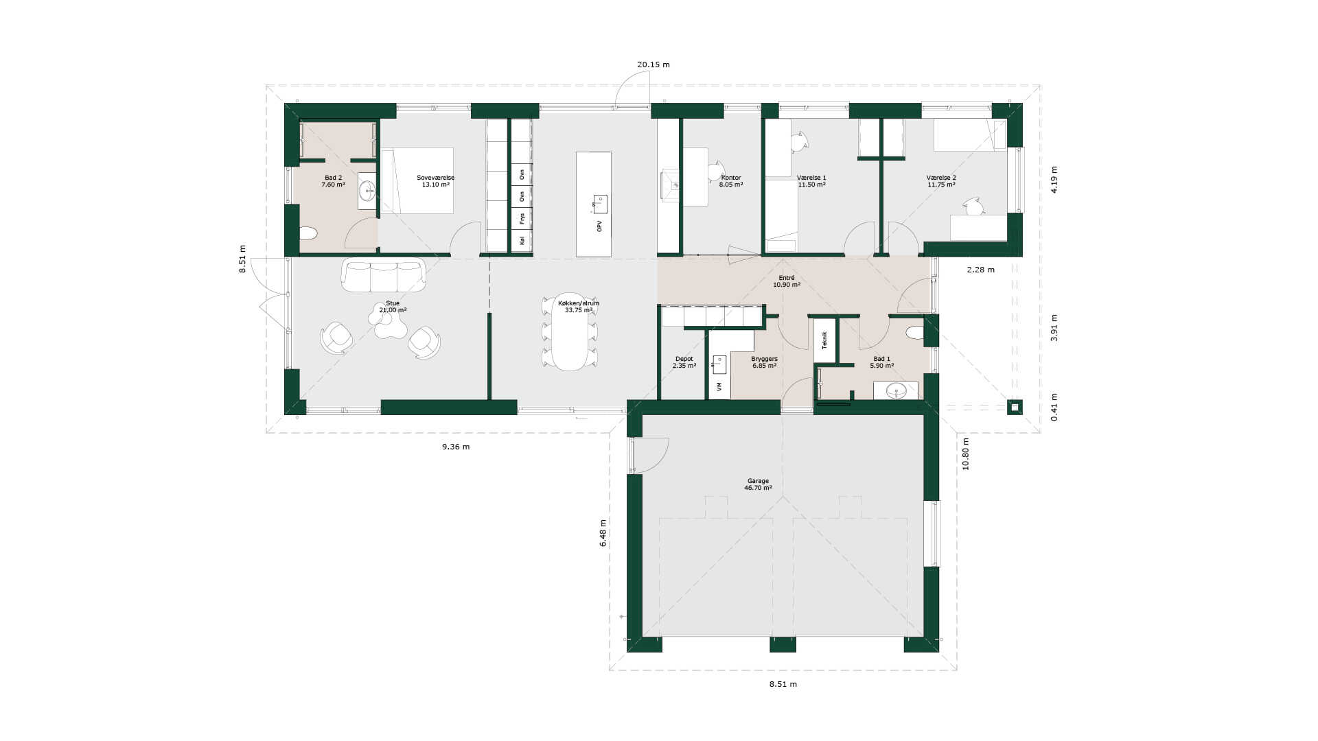 Planløsningen byder både på integreret garage og et overdækkede indgangsparti. Yderligere et skønt gennemgående køkken/alrum med kogeø og depot, der ligger centralt i huset, og derfor bliver et naturligt samlingspunkt for hele familien. Huset indeholder soveværelse med direkte adgang til stort badeværelse, to store værelser, et lyst kontor samt et praktisk bryggers med direkte adgang fra garagen.