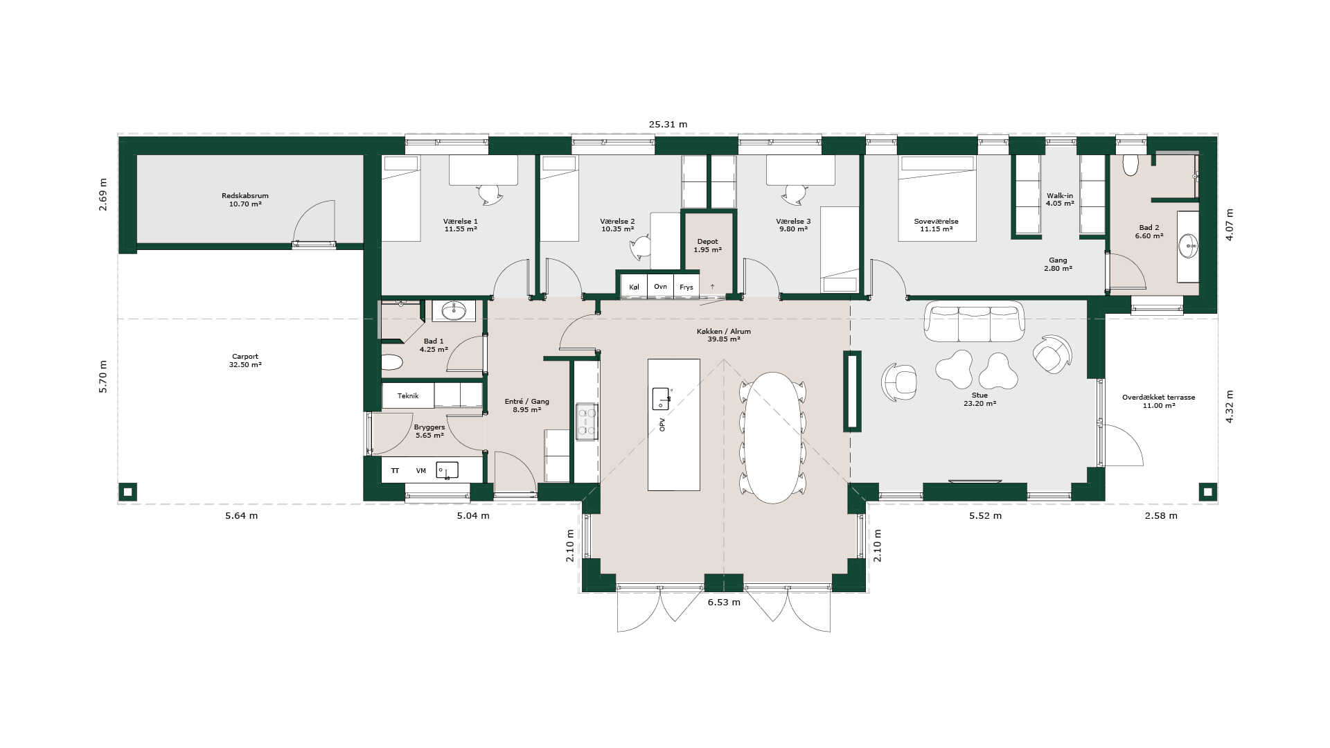 Fra carporten er der direkte adgang til bryggers. Derudover stort lyst køkken/alrum med mulighed for biopejs, der kan opleves både fra køkken/alrum og stue. Fra stuen er der direkte adgang til overdækket terrasse. Stort soveværelse med eget badeværelse, walk-in samt to gode børneværelser med eget badeværelse samt kontor.