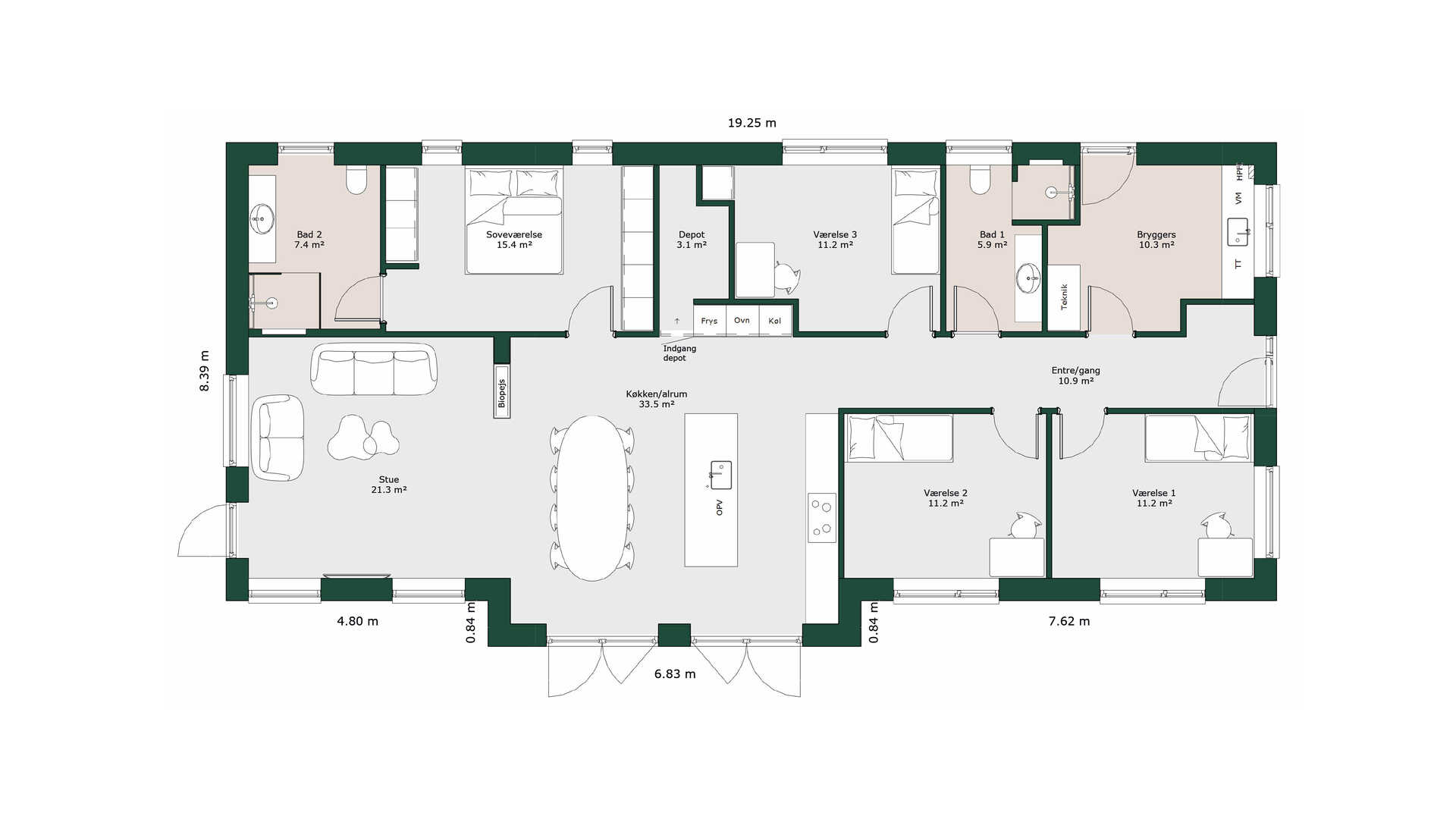 Planløsningen byder på separat børneafdeling med tre gode værelse, badeværelse og et stort praktisk bryggers.
