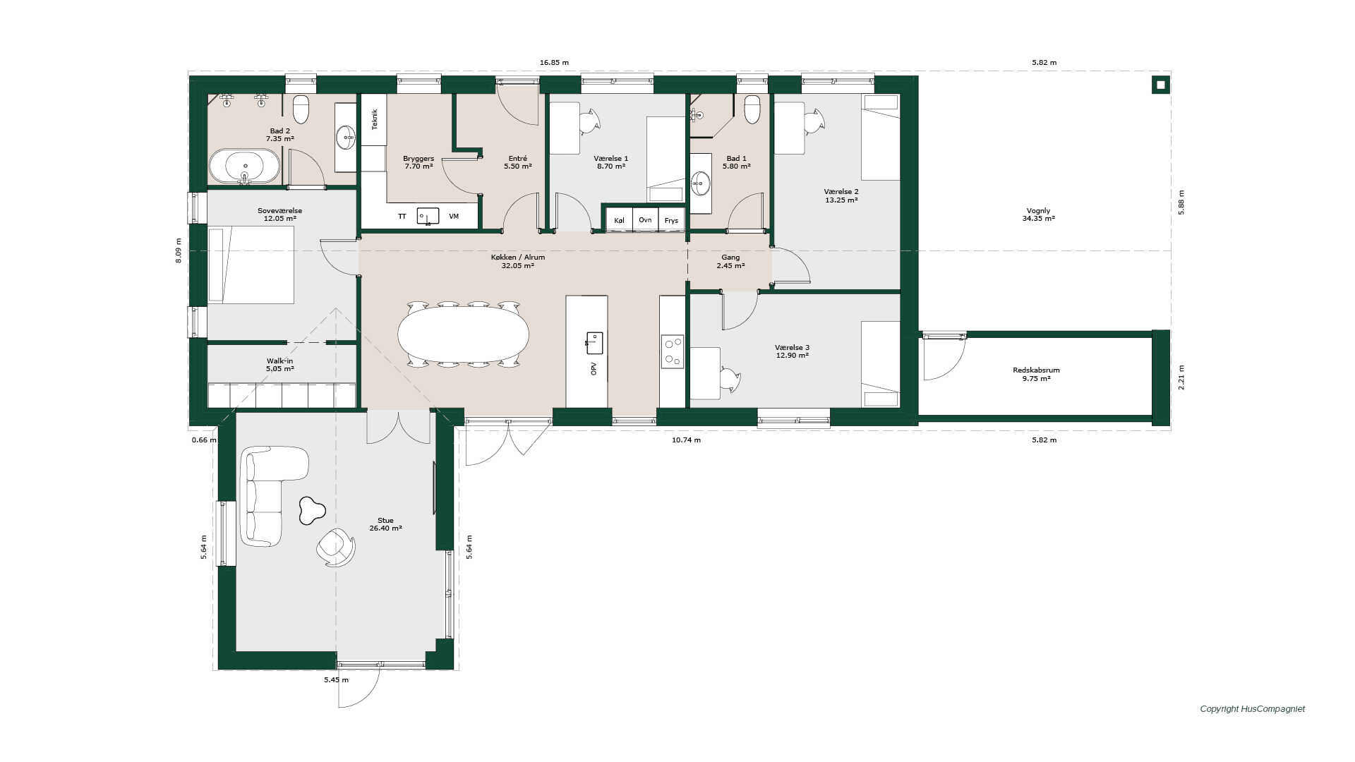 Denne indretning danner en treenighed mellem køkken/alrum, stue og terrasse med masser af lys og gennemgang. Desuden tilgodeser indretningen både et par store, flotte børneværelser, et lidt mindre værelse til fx kontor og gæster og en hel forældreafdeling med lyst soveværelse, walk in og badekar.