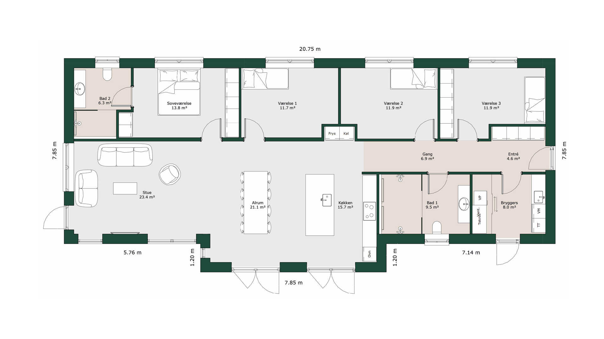 Planløsningen rummer tre store værelser, to gode badeværelser hvoraf det ene er med dobbeltbrus. Det store køkken/alrum ligger i åben forbindelse med stue og har flere udgange til terrasserne.