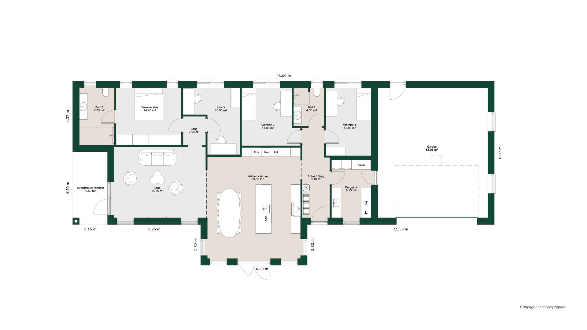 Lys entré og bryggers med egen indgang. To store værelser samt badeværelse. Centralt i huset ligger det store åbne køkken/alrum med stor vaske-ø og mange indbyggede skabe. Fra alrummet kommer man ind i stuen, hvorfra der er adgang til den overdækkede terrasse. Lille fordelergang, der giver adgang til kontor samt soveværelse med eget bad.