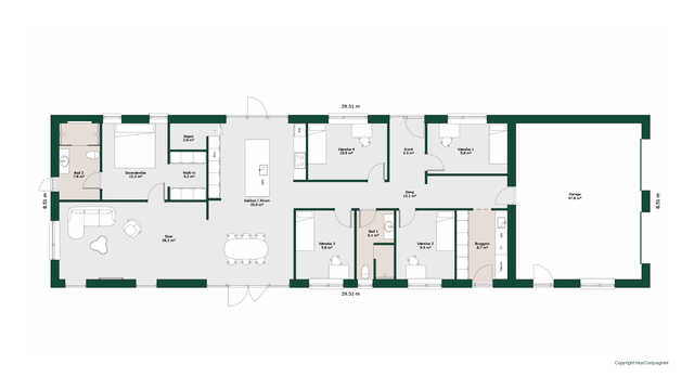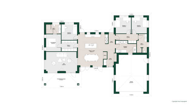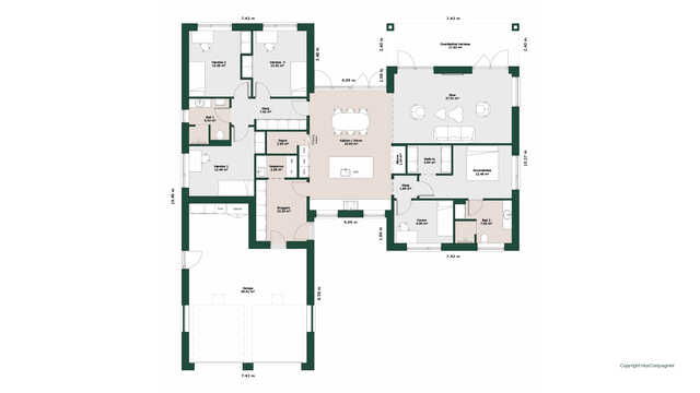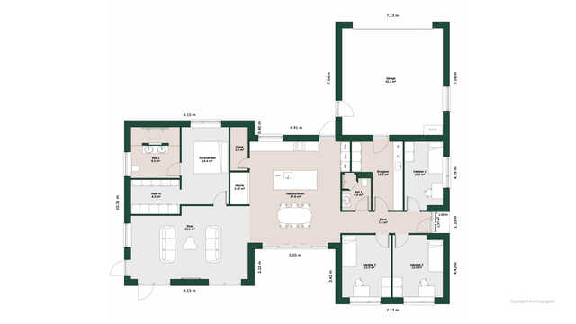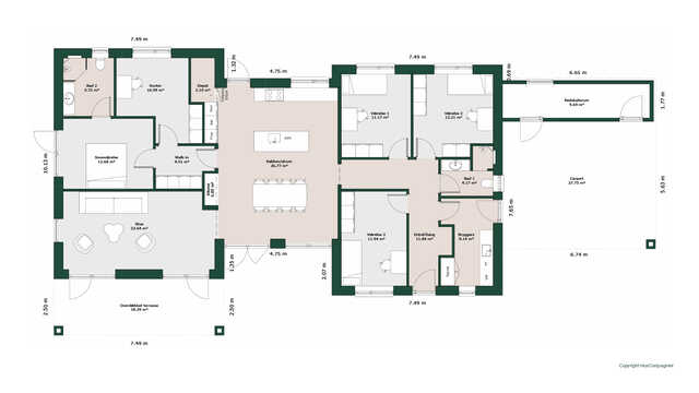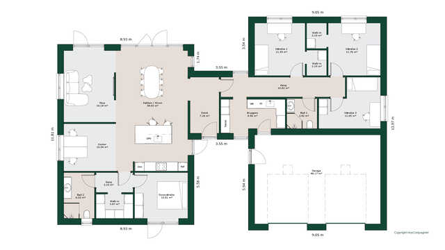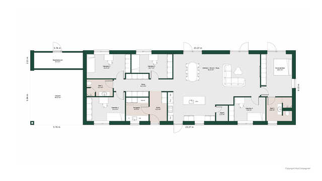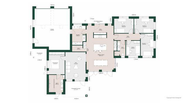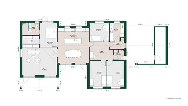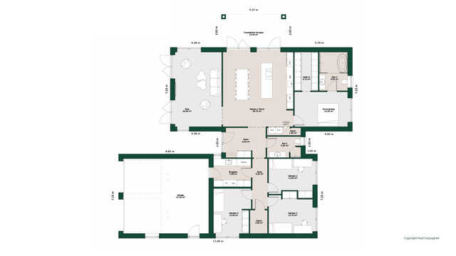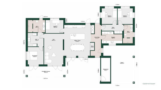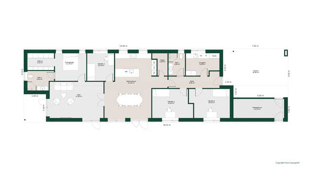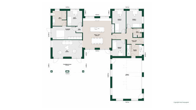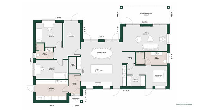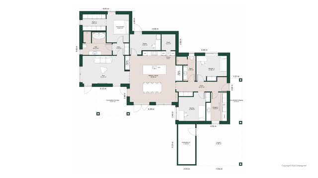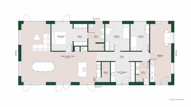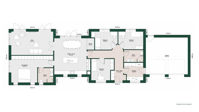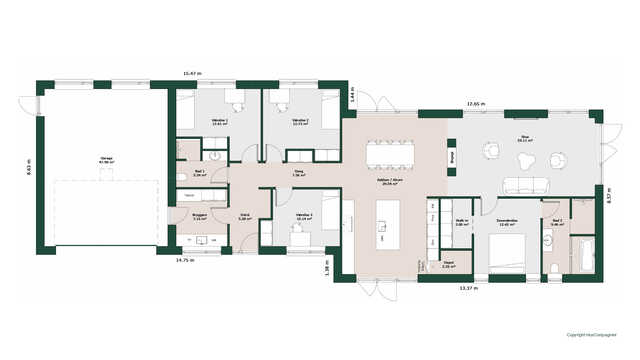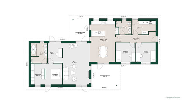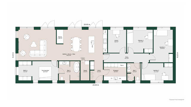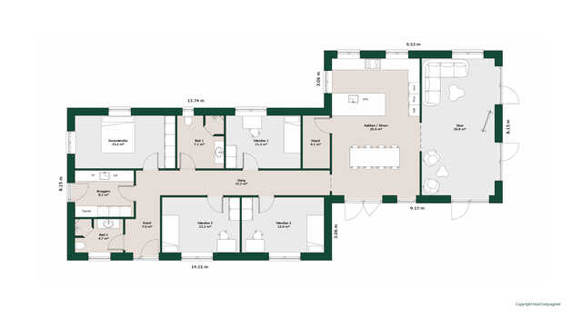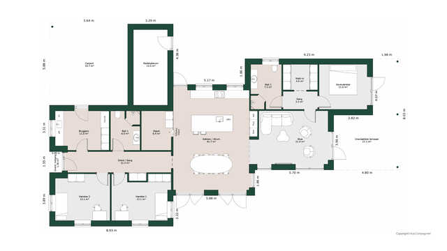 Planløsningen byder på et stort køkken/alrum med skjult depot og udgang til terrasser på to sider. Her er masser af lysindfald og adgang til den hyggelige stue.
