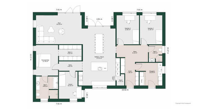 To af husets værelser ligger i separat afdeling og forældresafdelingen har walk-in og badeværelse med dobbeltbrus.