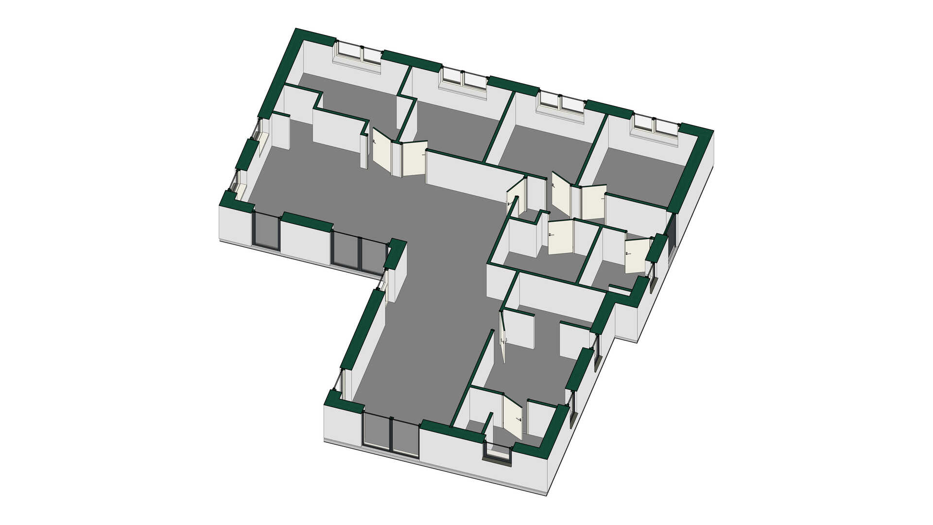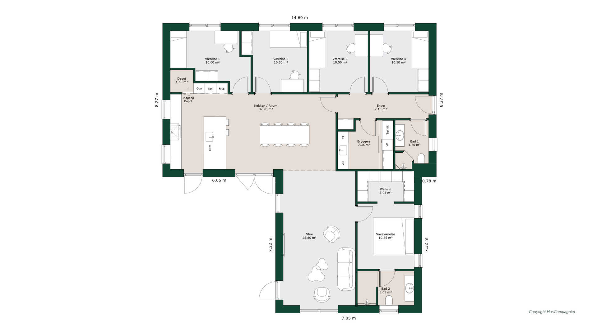 De fire børneværelser er af god størrelse og ligger ud til fællesrum/entréen. Det store køkken/alrum har udgang til terrasse og lille skjult depotrum. Stuen ligger i åben forbindelse med alrummet, men vinklen skaber en naturlig opdeling af rummene. Her indeholder voksenafdelingen både walk-in, badeværelse og soveværelse.