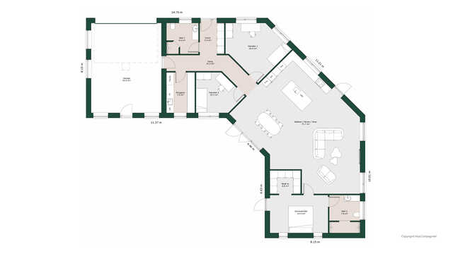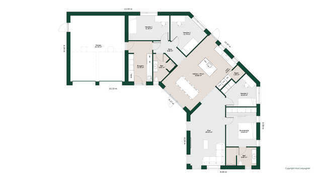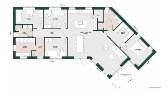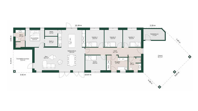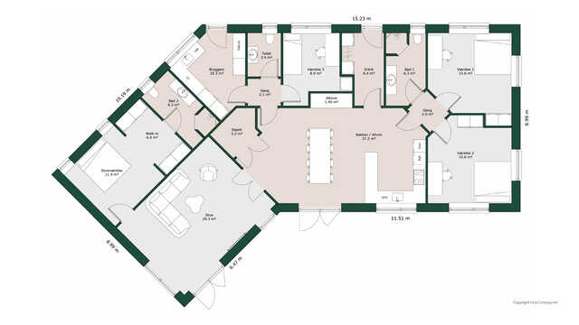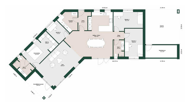 Husets køkken/alrum og stue byder på lækre detaljer som vinrum, biopejs og hele fire udgange til haven.